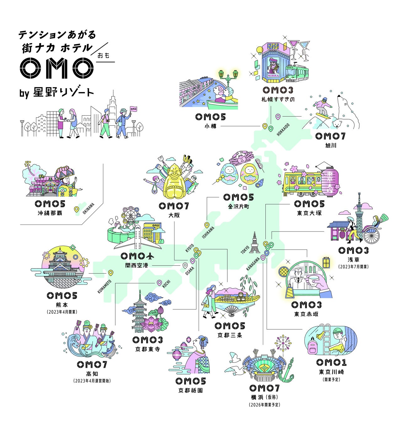 「OMO」は星野リゾートが全国に展開する「テンションあがる『街ナカ』ホテル」。街をこよなく愛するスタッフが地域の方々と仕掛ける、新感覚のホテル。思いもよらない魅力に出会い、知らず知らずのうちにその街までお気に入りに。現在、15施設展開中。2023年7月31日には「OMO3浅草」が誕生しました。