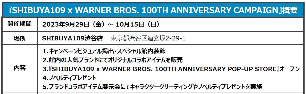 『SHIBUYA109 x WARNER BROS. 100TH ANNIVERSARY CAMPAIGN』2023年9月29日(金)~ 10月15日(日)