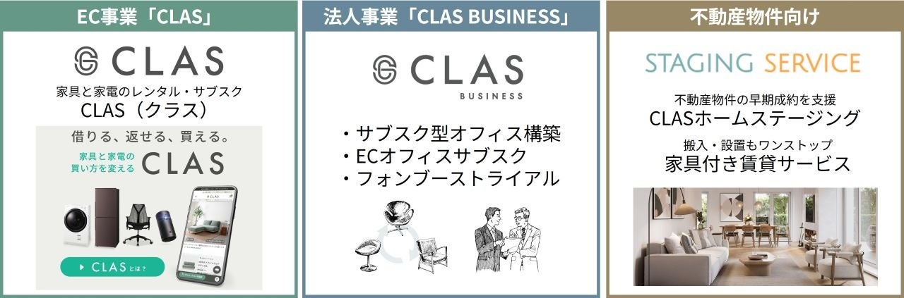 個人向けに家具と家電のレンタル・サブスク「CLAS」、オフィス構築とフォンブースのお試し利用ができる法人向け「CLAS BUSINESS」、不動産物件の早期成約を支援するインテリアコーディネート「CLASホームステージング」「家具付き賃貸サービス」と事業展開しています。