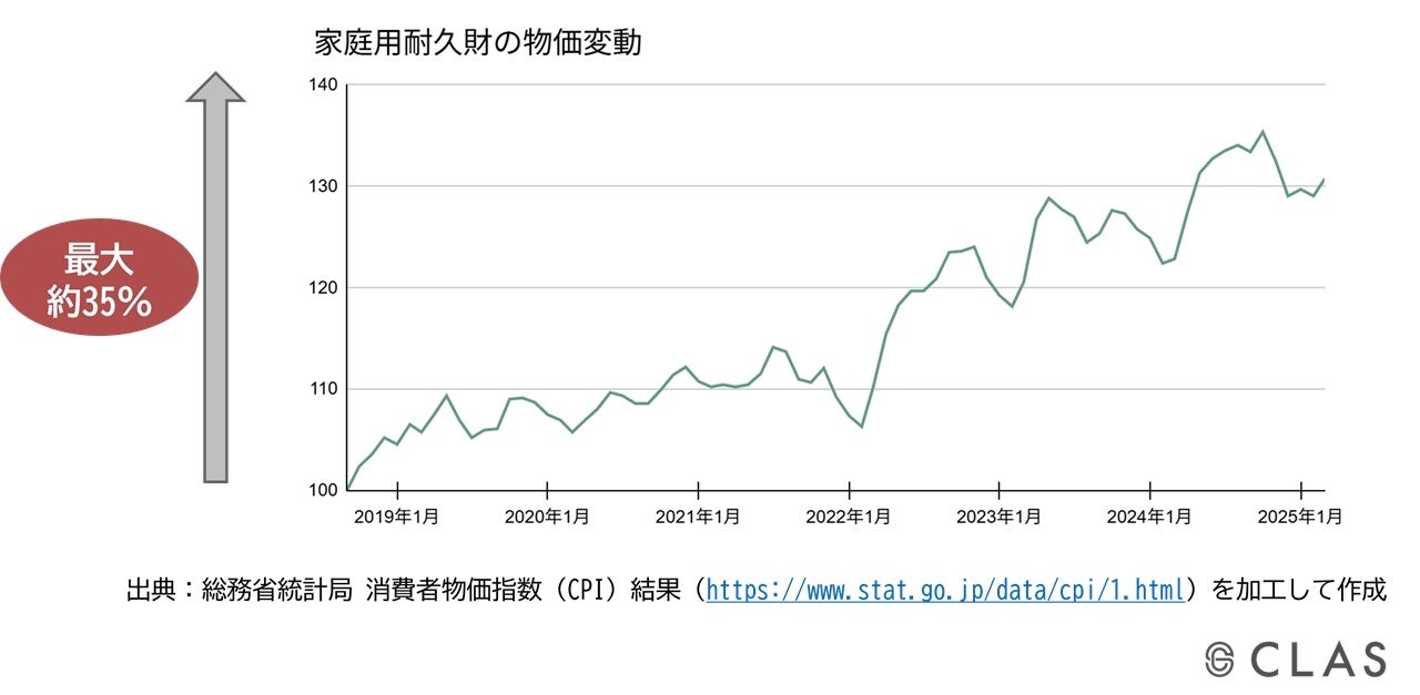 総務省統計局が2025年4月18日に発表した、消費者物価指数(CPI、2020年=100)によると、2025年3月の家庭用耐久財の前年同月比は6.5%増と、2025年2月の5.4%増から増加幅が拡大しており、今後も価格上昇の傾向が見込まれます。また、物価高騰が続く中、家庭用耐久財の消費者物価指数(全国平均)は、2018年のCLASのサービスリリース期と比較し、最大で約35%上昇しています(※3)。