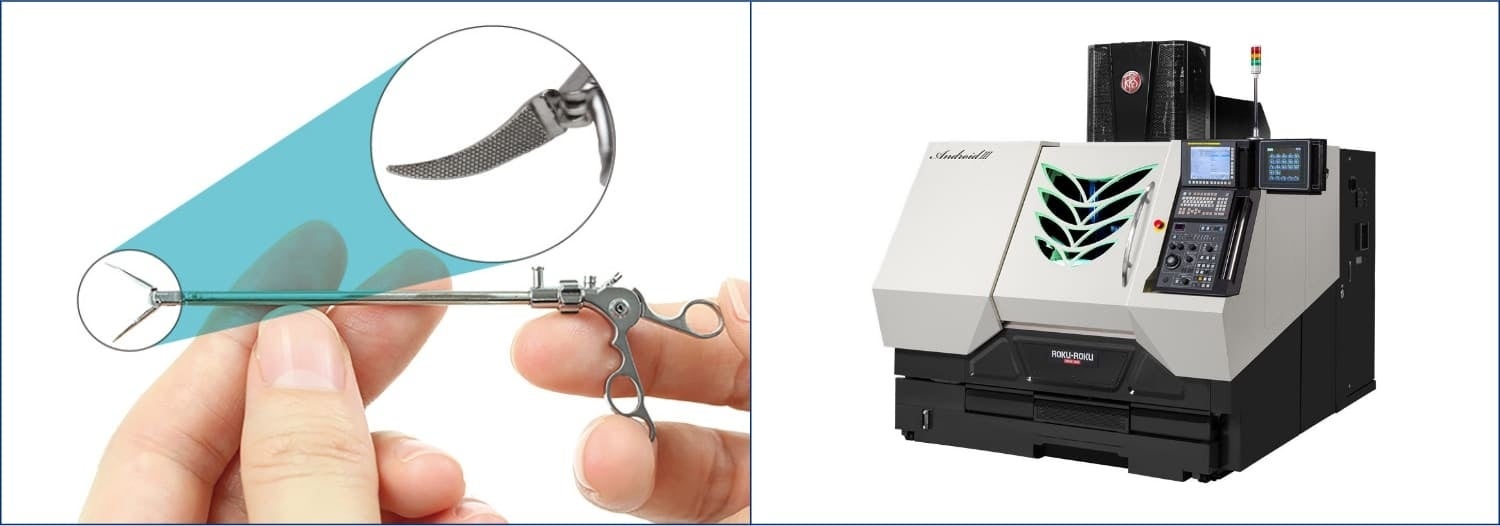 会場では碌々スマートテクノロジーの超高精度高速微細加工機「AndroidⅢ」を用い、複数の構成部品の中で最も微細な形状を持つ金型部品(鉗子の先端にある爪のローレット形状)の加工技術を披露します。
