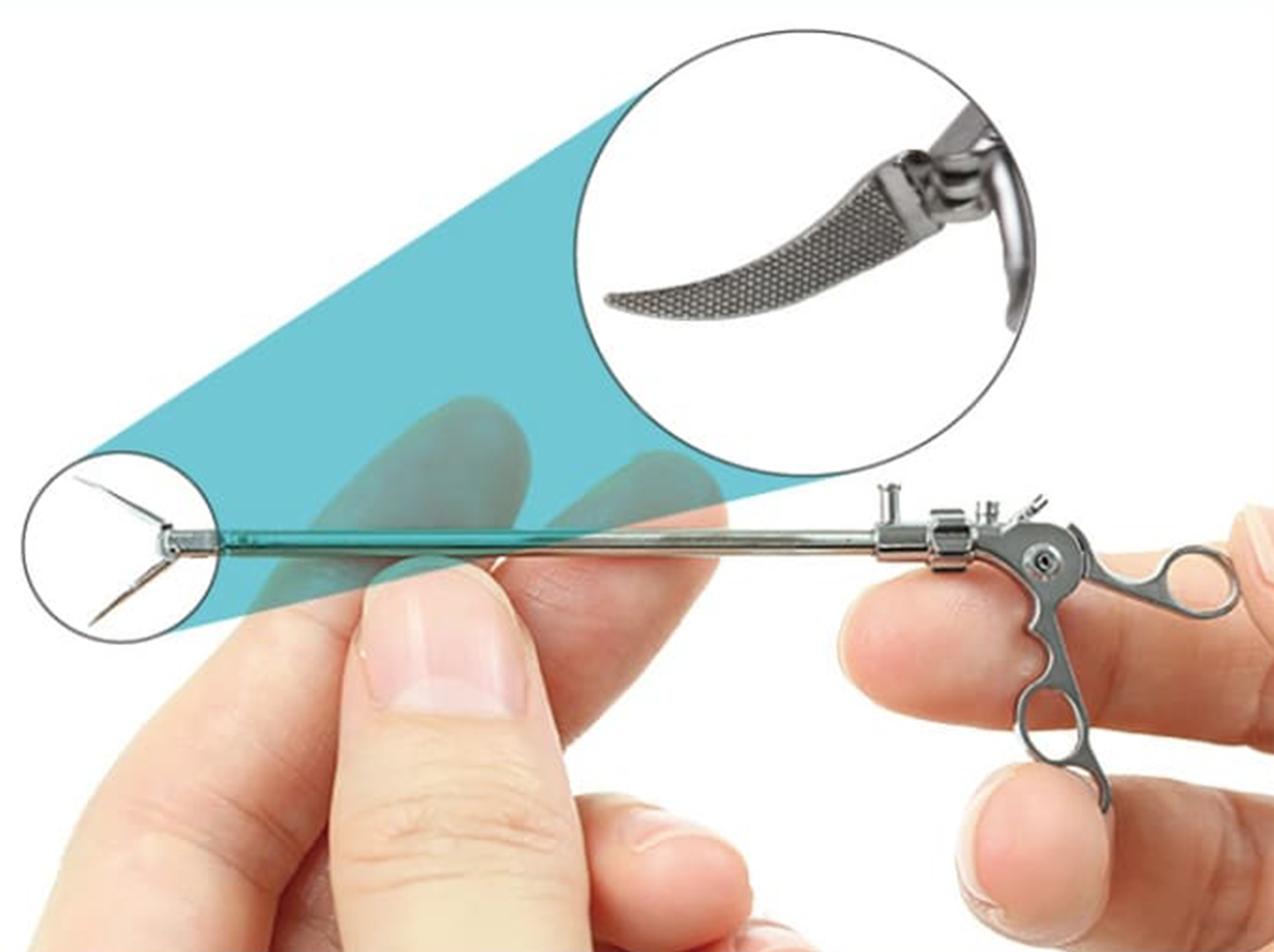 腹腔鏡手術で使用される医療器具「鉗子(かんし)」を手のひらサイズ(約95㎜)で再現。部品の製造には金属粉末射出成形法(MIM)を用いており、製品の可動部分は本物同様に動かせます。