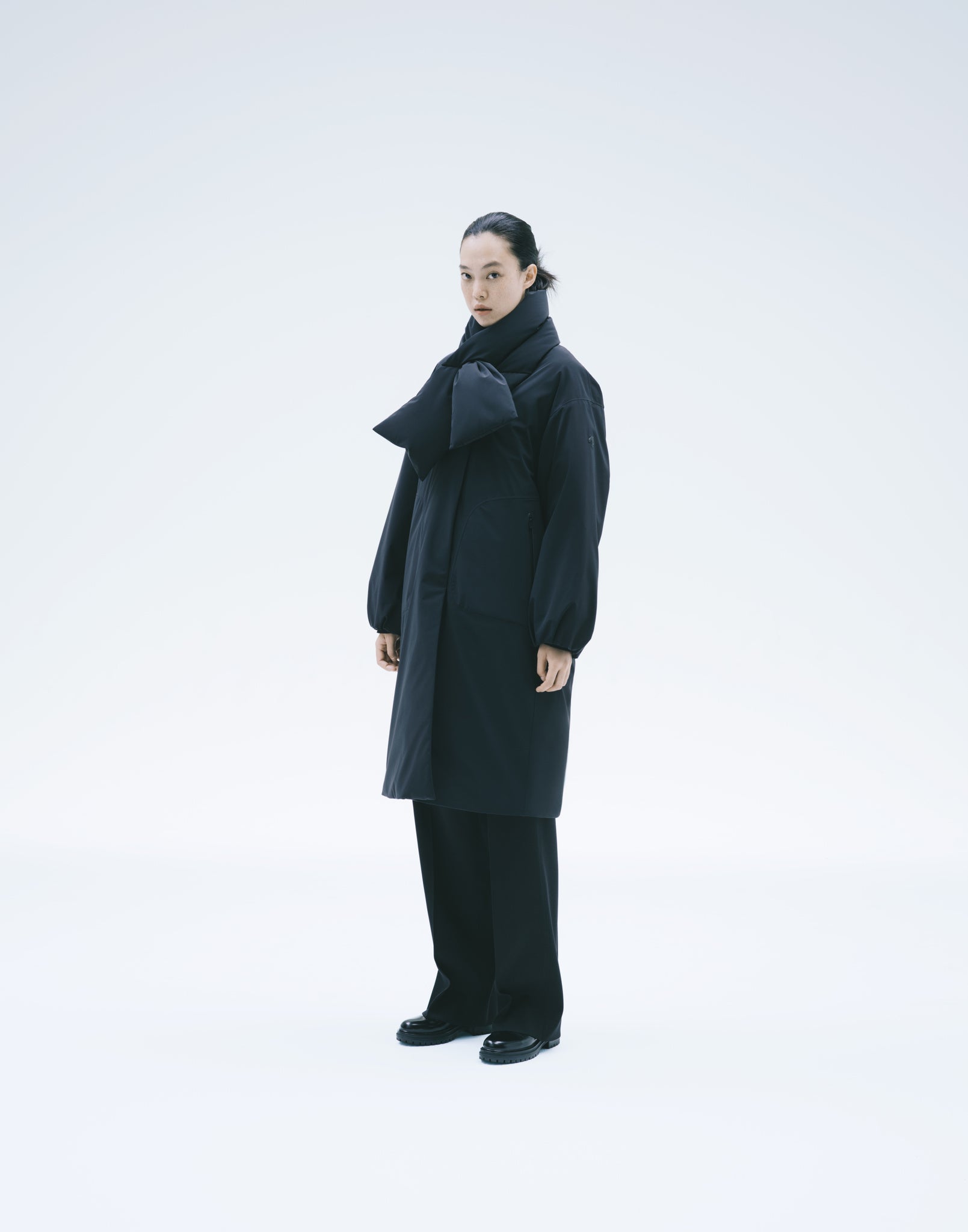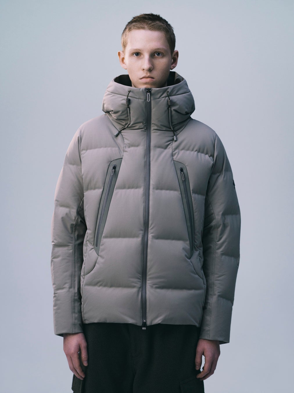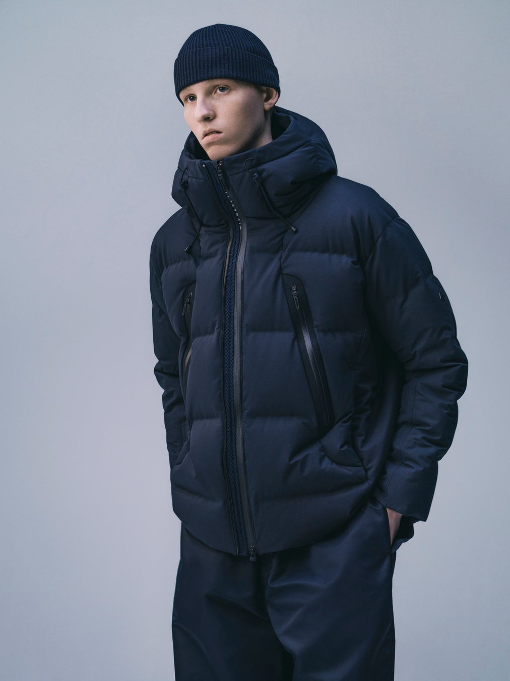 これらの課題を払拭するため、ダウンパックの形成には縫製ではなく特殊な熱圧着技術を採用し、ステッチを排除。袖などの縫製が必要な箇所には裏面にシームテープ加工を施すことで雨や雪の日の快適性を飛躍的に向上させることに成功。「防水性」と「耐水性」を備え、ダウンジャケットに新しい価値を創造しました。一見、ハイテクジャケットにも思えるこのダウンジャケットは、裁断、ダウンパックの形成、熱圧着加工、ダウン詰めまで、すべての工程において経験豊富な職人の手によって一つ一つ形作られています。異彩を放つデザインも常識を覆したテクノロジーもすべては、ひとりひとりの手と情熱により支えられています。