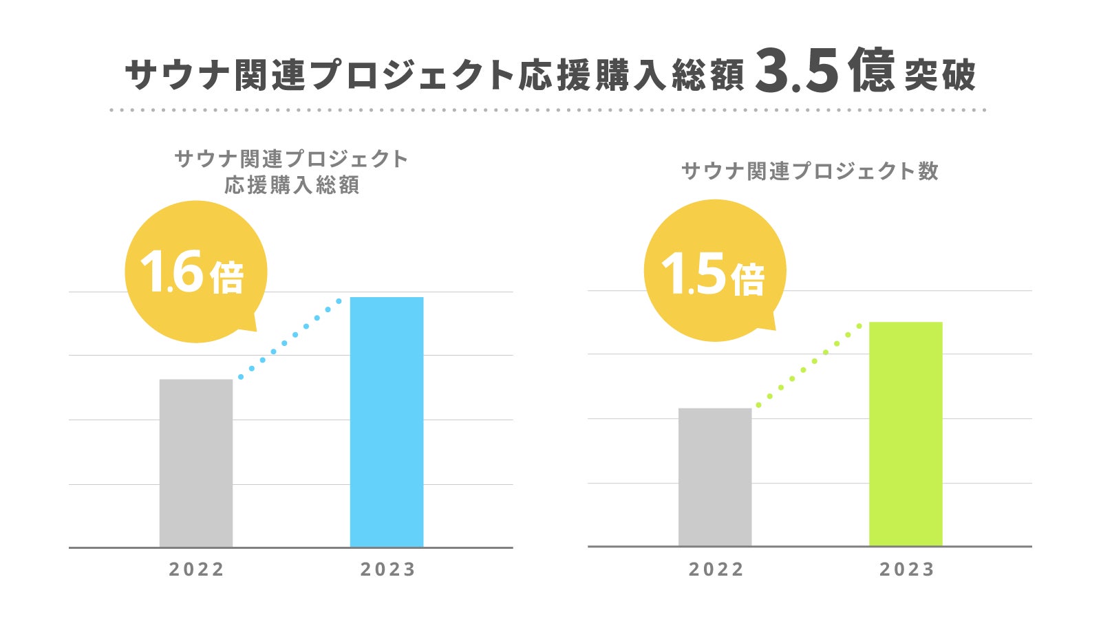 「Makuake」では2022年までにも多数のサウナ関連のプロジェクトが実施されていました(※1)が、新型コロナウイルス感染症の5類移行後にリアル消費が加速した影響を受け、2023年も多くのサウナ関連プロジェクトが「Makuake」から誕生しました。2023年10月31日(水)時点のサウナ関連プロジェクトを対象にしたデータでは、累計応援購入総額が3.5億円を突破、前年比1.6倍となり、「Makuake」の中でも人気のジャンルとなっています。また、サウナ関連のプロジェクト数も前年比1.5倍となり、サウナ関連の実行者による「Makuake」活用が進みました。
