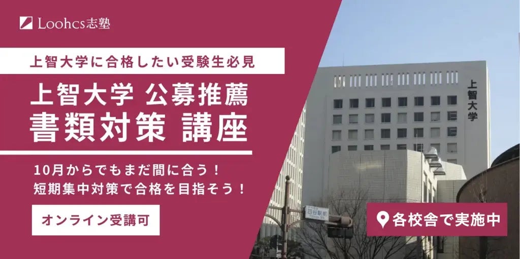 Loohcs株式会社(代表取締役 :嶺井 祐輝 本社所在地: 渋谷区桜丘町)は、同社運営の総合型選抜・AO推薦入試専門の学習塾「Loohcs志塾」において、上智大学公募推薦入試書類対策講座を実施することをお知らせいたします。