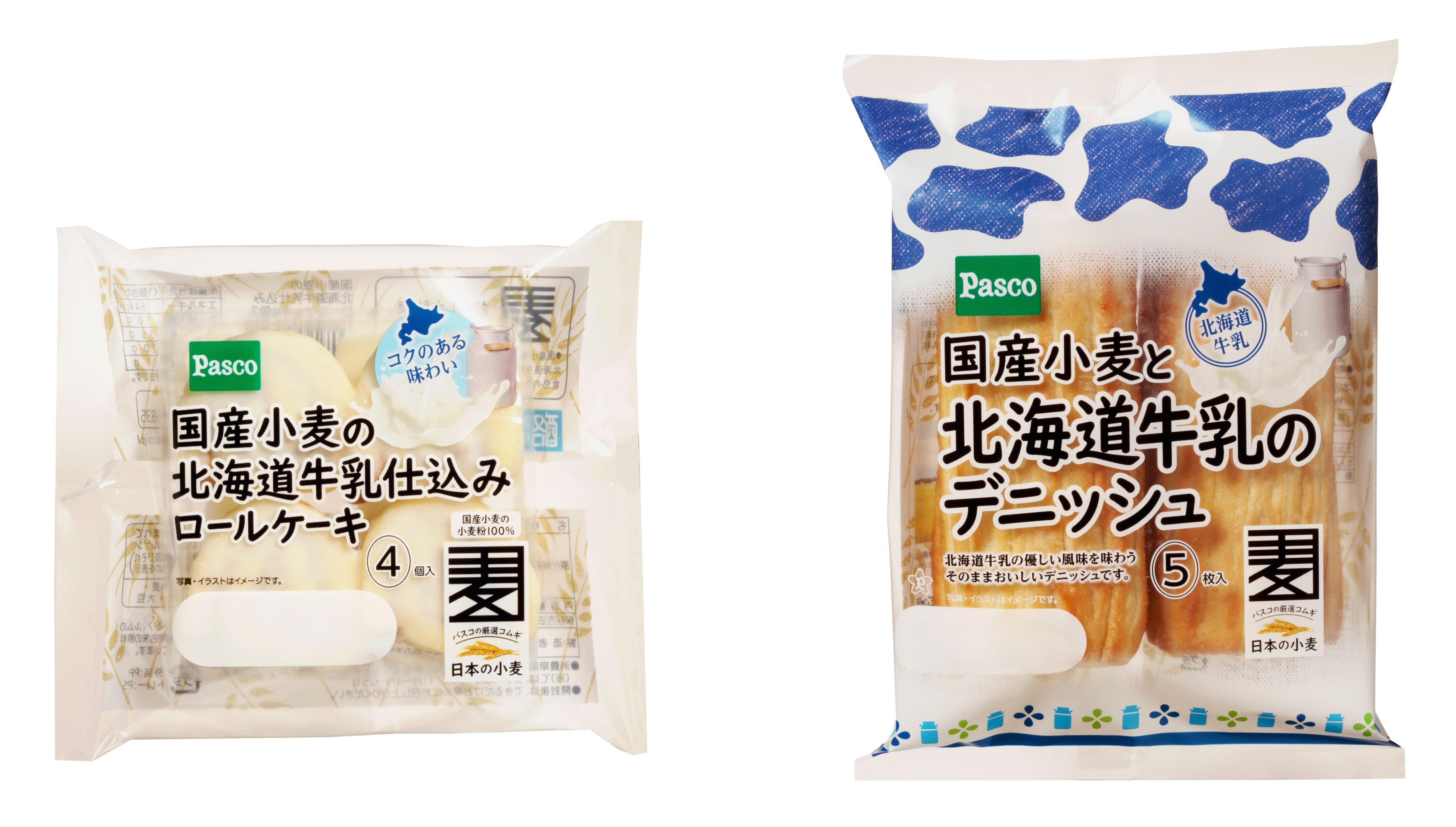 国産小麦シリーズの新商品「国産小麦の北海道牛乳仕込みロールケーキ4個入」「国産小麦と北海道牛乳のデニッシュ5枚入」