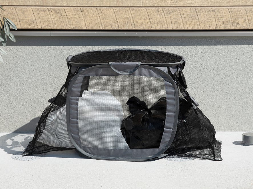 フタの留め具は、マグネット式で簡単に開けることはもちろん、しっかりと閉めることでカラスや野良猫からの被害を防ぎます。また側面のマグネットを外すと、ネットが拡がるように設計されています。普段よりも出すゴミが多くなる日も、拡張した分だけ多く入れることが可能になっています。