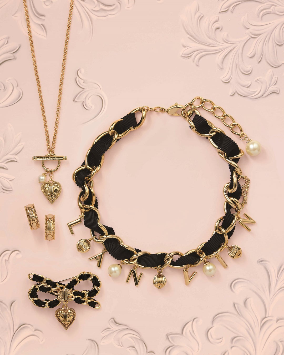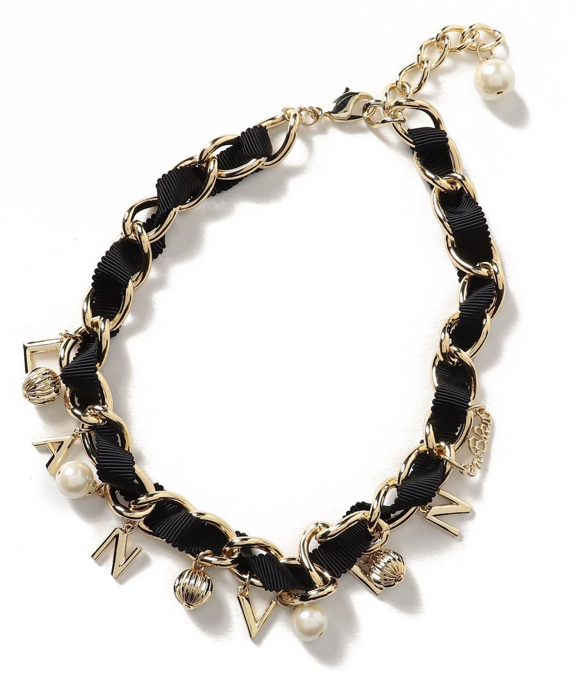 ブラックのグログランリボンを通したチャンキーチェーンのネックレスは、LANVIN en Bleuのチャームとパールが揺れ、ボリュームたっぷりの高級感ある仕上がり。