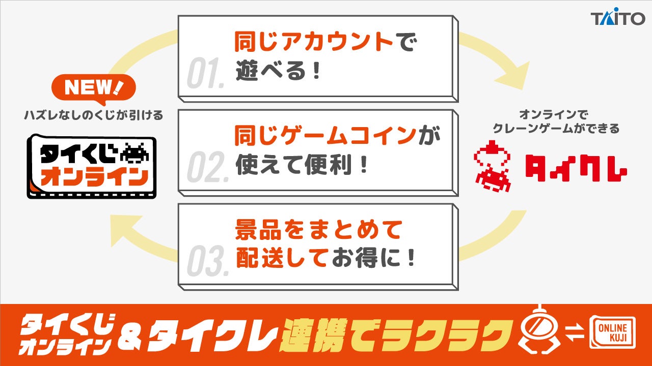 登録者数330万人を突破したタイクレと連携しており、タイクレでユーザーIDご登録の方はタイくじオンラインへの新規登録不要でスムーズにご利用いただけます。また、タイクレで使用している通貨TC(タイトーコイン)の共用や、さらに配送システムも連携しているため、タイくじオンラインで引いた商品とタイクレで獲得した景品を同時に配送依頼すると実質配送料無料となる特典もご用意しております。両サービスの連携でよりスムーズに充実したオンライン体験をご提供して参ります。