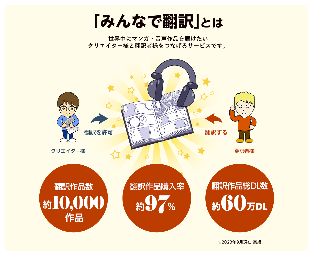 『みんなで翻訳』は原作者が翻訳の許可を出すだけで翻訳版が販売されるという手軽さから、2023年9月時点で3万作以上の翻訳許可をいただき、すでに1万作品以上が翻訳されております。そして翻訳された作品の97%が海外ユーザーに購入されており、総購入数は60万ダウンロードにも及びます。中には翻訳作品だけで1万ダウンロードを超える作品も登場しております。登録している翻訳者は6千人を超えており、この度の言語の追加でより翻訳者の方も増えると予想されます。