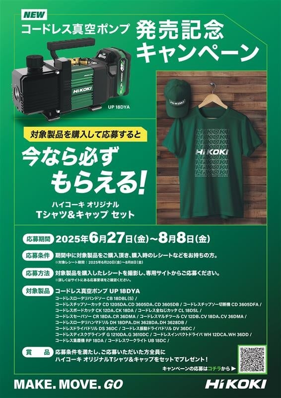 本広告キャンペーンでは同時に、コードレス真空ポンプ「UP18DYA」を購入すると応募者全員に「ハイコーキオリジナル Tシャツ&キャップ」のセットが必ず貰えるキャンペーンも実施しています。