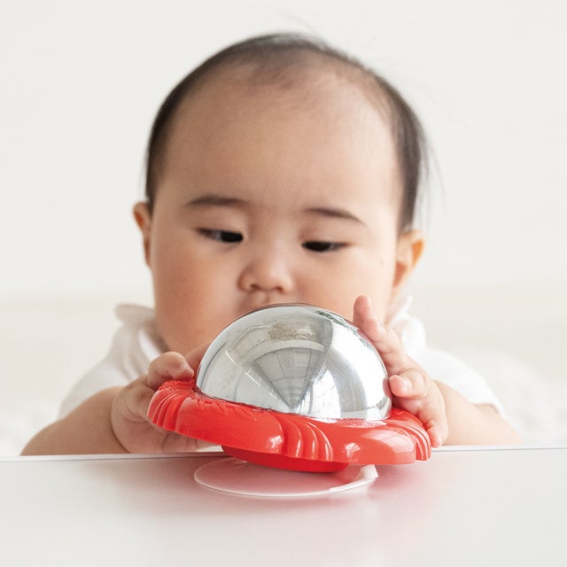 不思議な球体の鏡にうつる自分の顔が気になる…まじまじ、じーっと集中して見つめる赤ちゃん多数。吸盤つきで、テーブルにつけて使用することが可能。思わず目に入る認識しやすいカラーに変更しました。
