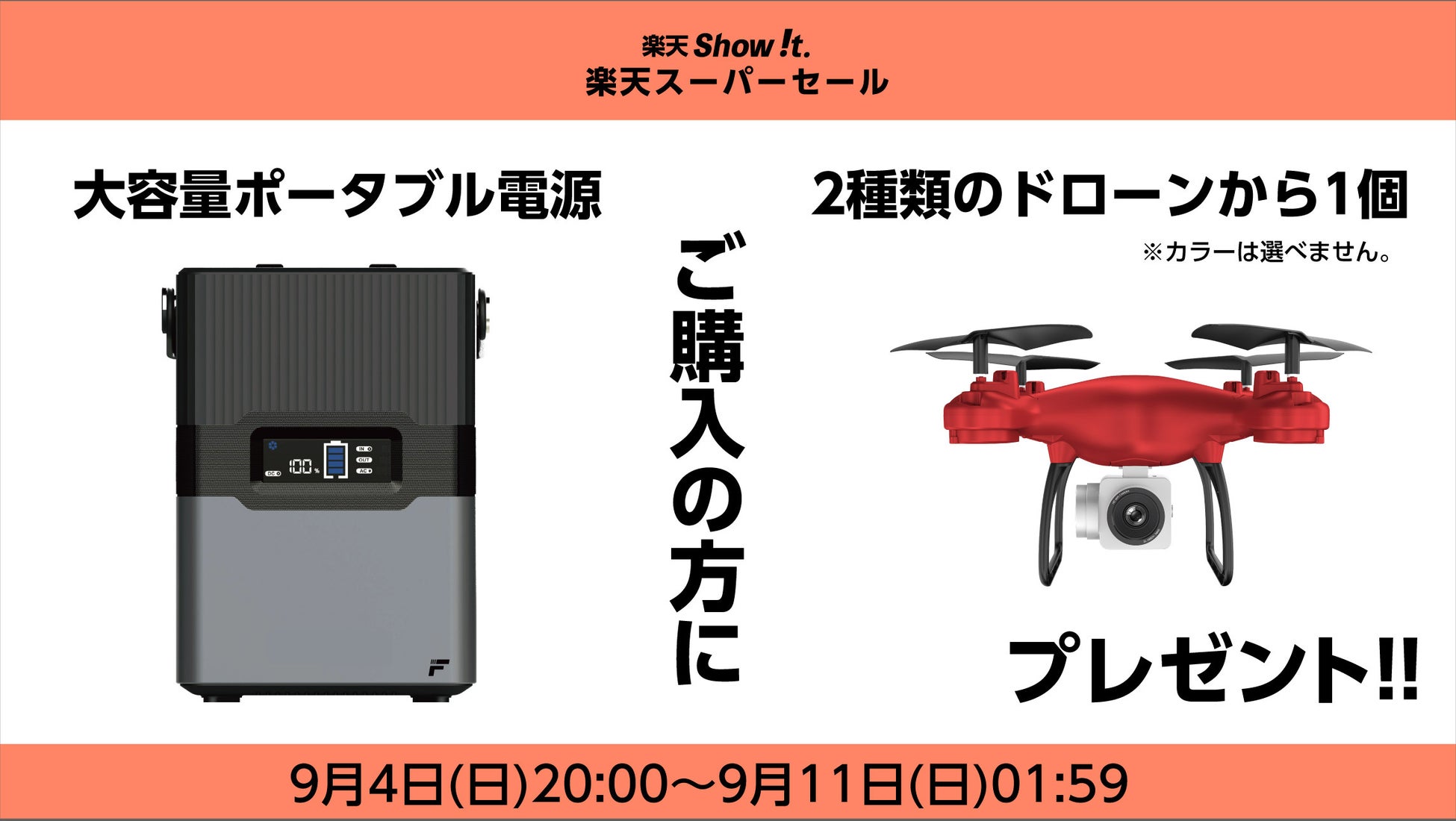 楽天市場「Show !t」プレゼントキャンペーン!9月4日(日)20時開始、大容量ポータブル電源ご購入で、選べる2種類のドローンから1個プレゼント。全商品ポイント10倍!楽天スーパーセールに参加。