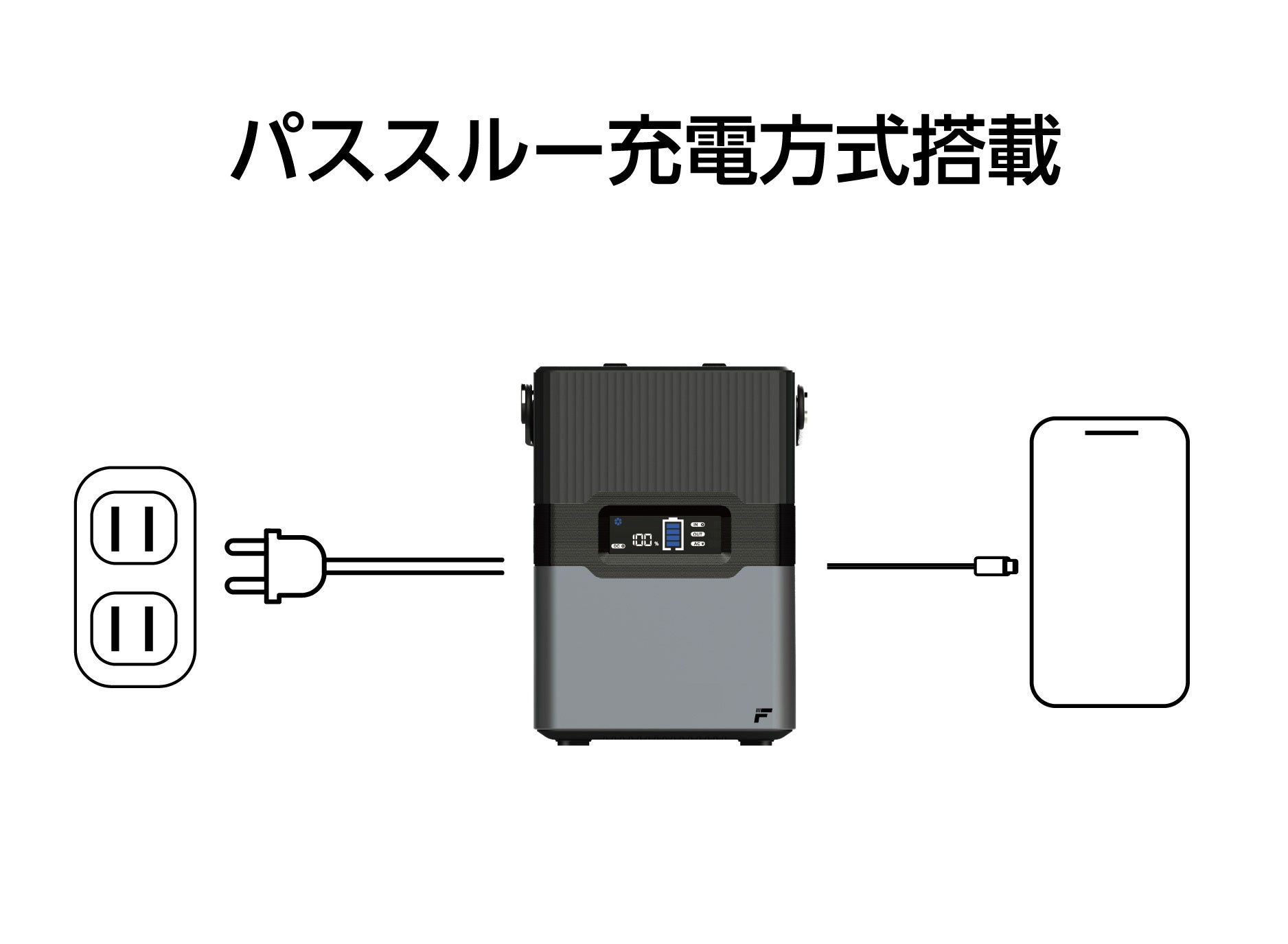 パススルー充電方式とは、スマートフォンなどのデバイスとポータブル電源の両方のバッテリー残量が少ない場合でも、デバイスとポータブル電源を同時に両方充電することが可能な機能です。