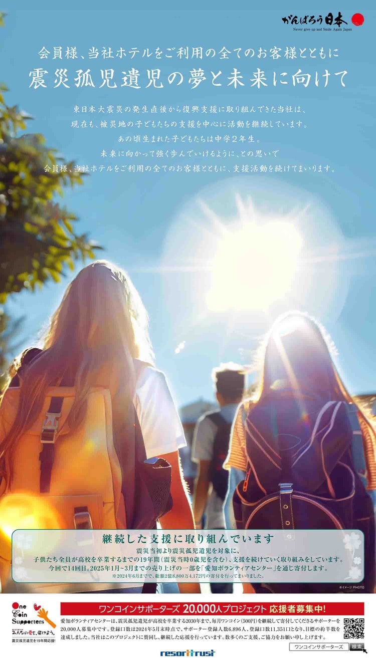 【リゾートトラスト】会員様とともに行う社会貢献 売上の一部を、東日本大震災で親を亡くした子どもたちへ寄付 継続する支援、今年で14年目