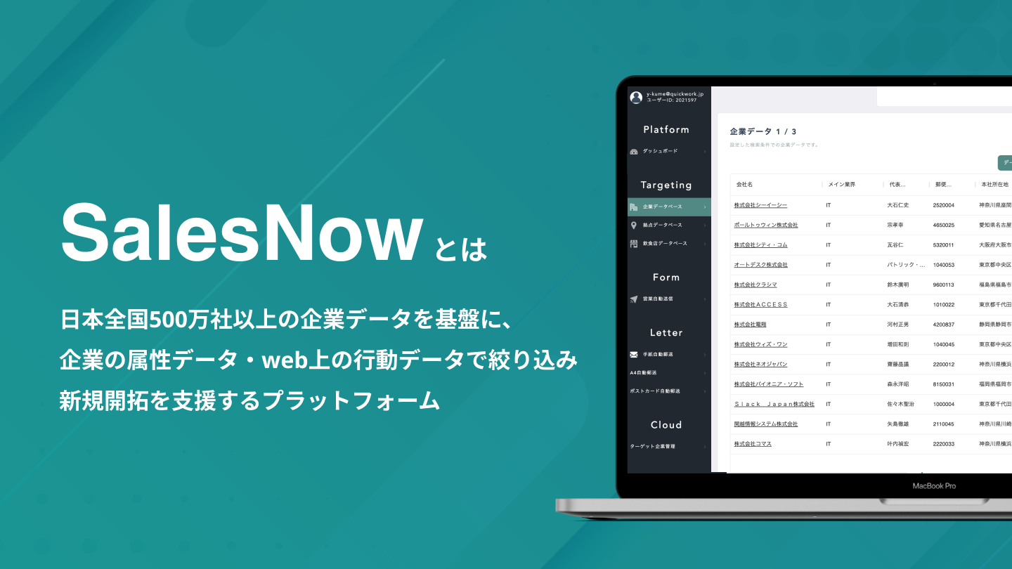 - 日本全国500万社以上の企業データを基盤に営業の効率化を支援する「SalesNow」 https://top.salesnow.jp/