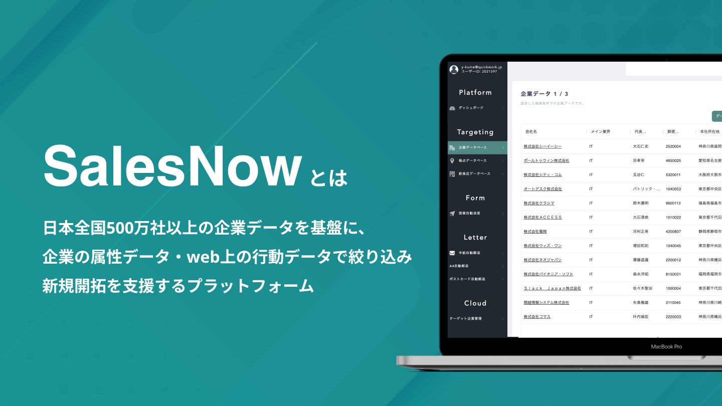 株式会社QuickWork、シリーズAラウンドで約2億円の資金調達を実施。日本全国500万社以上の企業データを基盤に営業の効率化を支援する「SalesNow」がさらに加速!