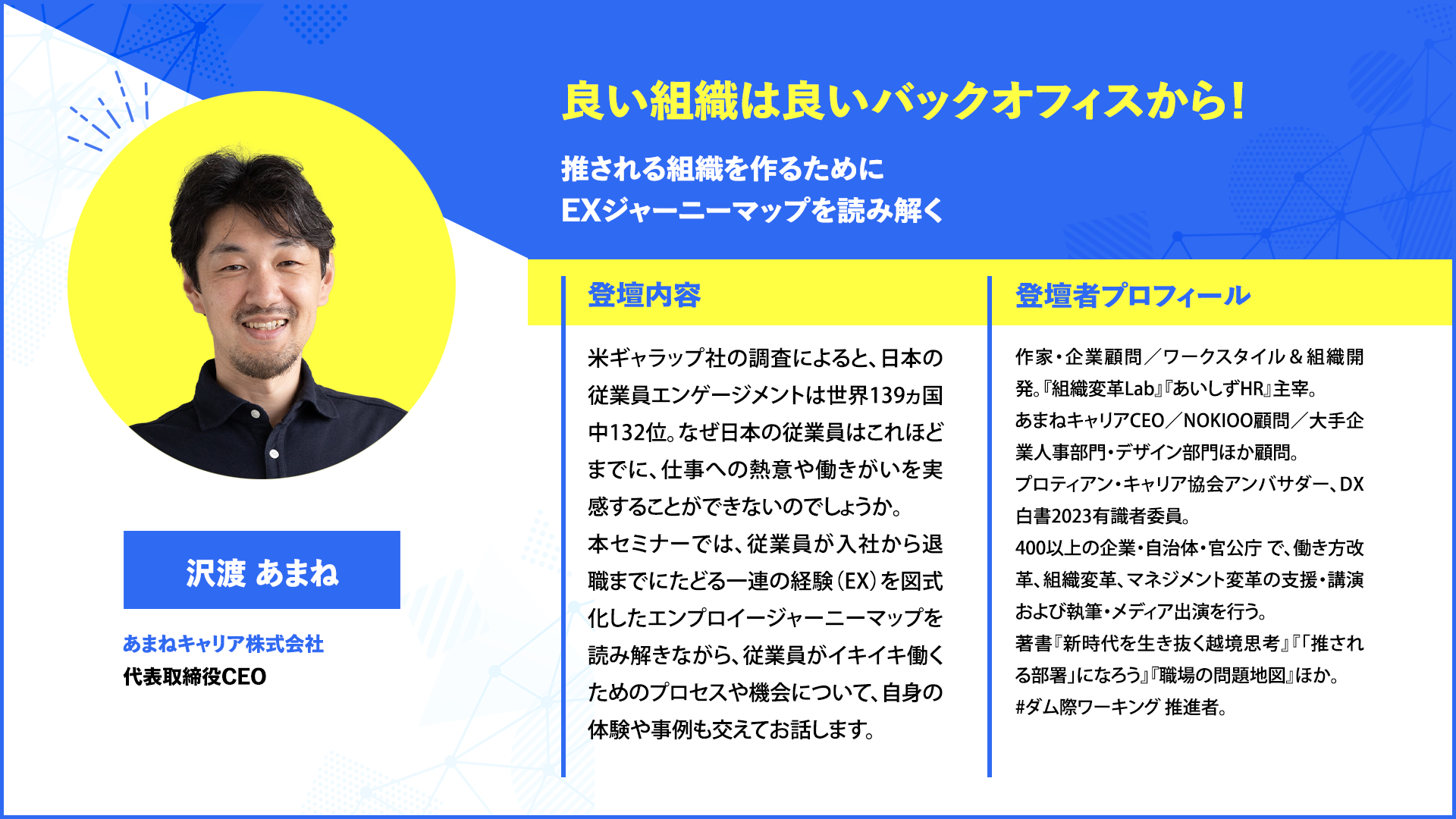 バックオフィスの各分野におけるトップリーダー12人が一堂に集まり、働きがいと効率を両立するための具体的なステップについて講演します