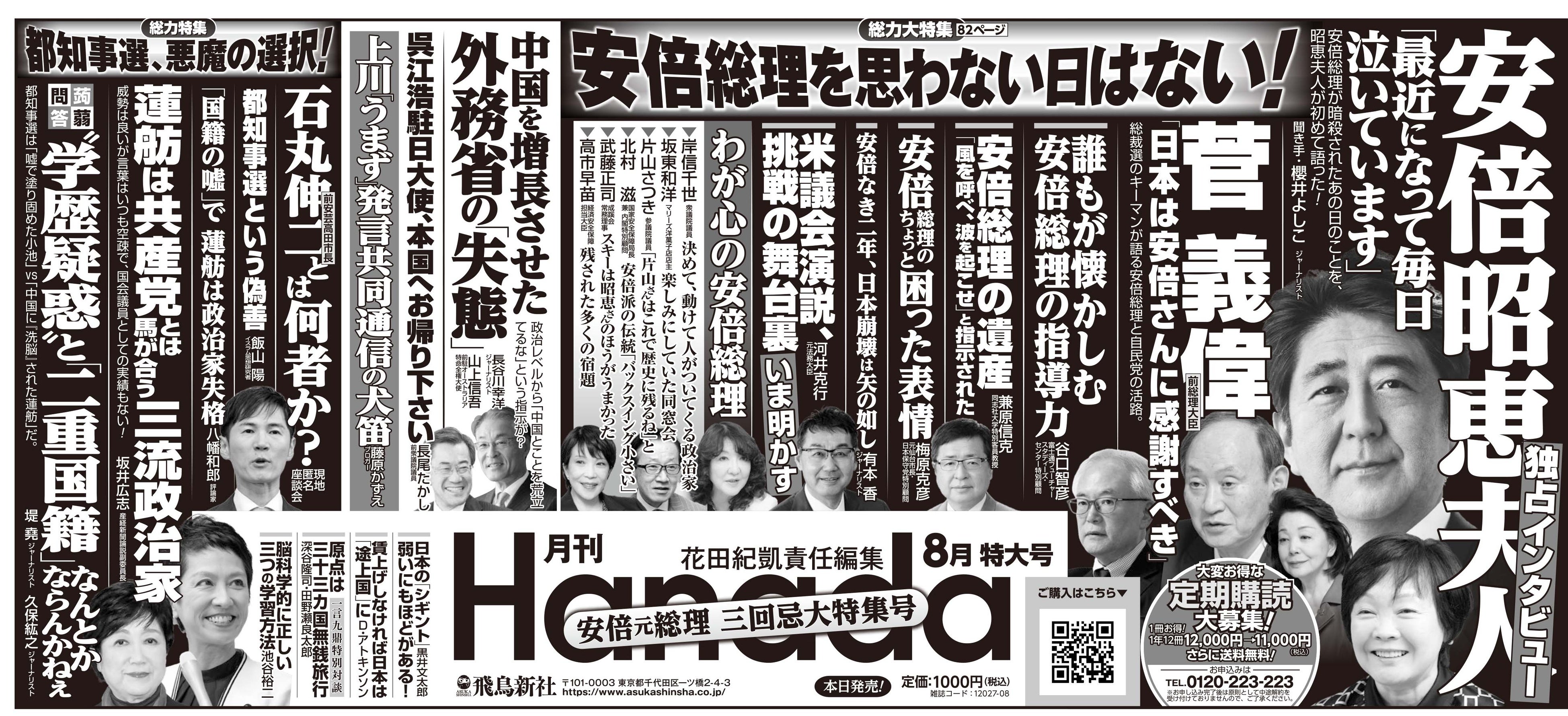 あの日から二年、安倍昭恵夫人が月刊『Hanada』8月号(飛鳥新社)において、事件後はじめてメディアのロングインタビューに応じ想いを語った。