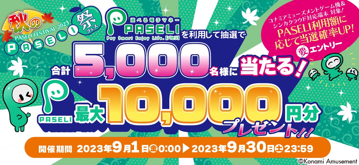 株式会社コナミアミューズメントは、KONAMIが運営する"遊べる電子マネー"「PASELI(パセリ)」を利用すると、抽選で「PASELI」のチャージコードが当たる「秋のPASELI祭2023(あきのぱせりふぇす2023)」を9月1日(金)から開始したことをお知らせします。
