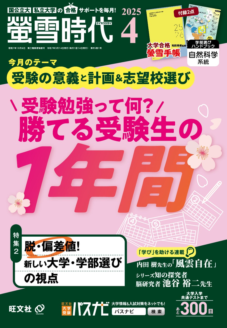 月刊 『螢雪時代』 では、志望校合格を目指す受験生のために、国公立大&私立大入試の効果的な受験対策法や学習計画、最新入試情報、大学の学問紹介など、タイムリーな記事を毎月お届けします。