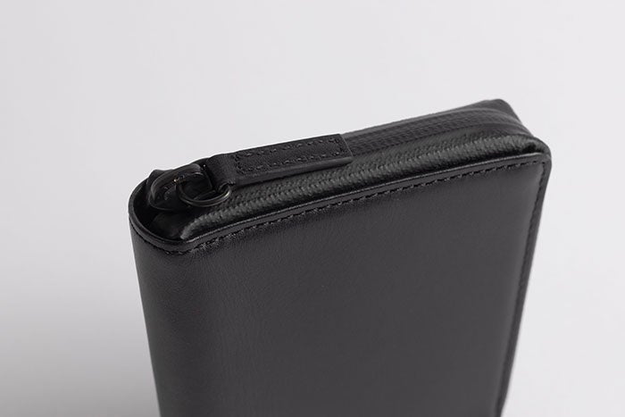 YKK製の止水ファスナー「AquaGuard®NATULON®」を装備しており、スコッチガード™皮革保護剤で加工したレザーが持つ高い撥水性と相まって、内部の水濡れへの対策は万全です。街中やアウトドアで急に雨が降っても、大切な紙幣や貴重品を守ります。
