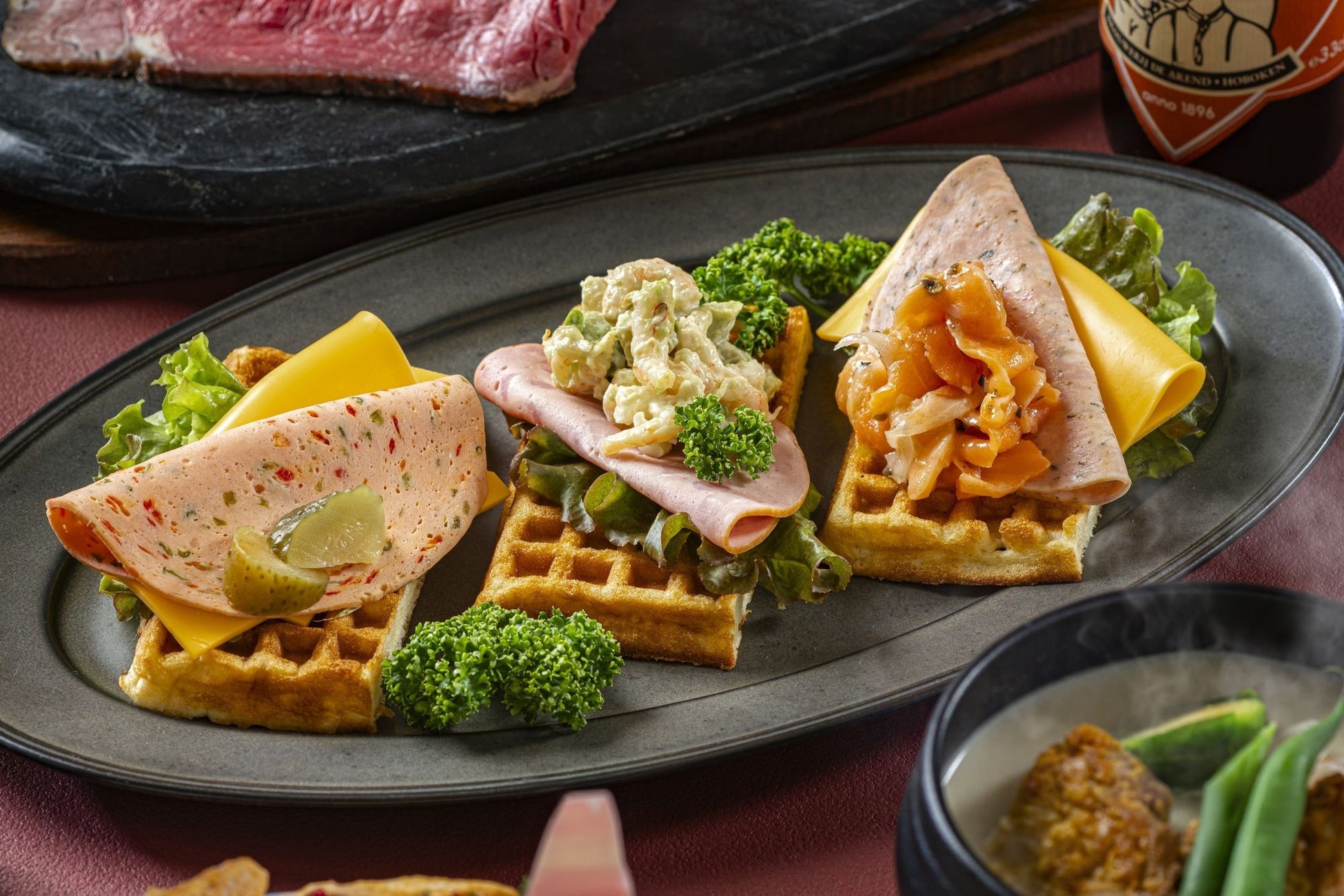2種類の特製ソースとの相性が抜群な、本場で親しまれているフライドポテト“ベルジャンフリッツ”は、カリっと揚げたてをライブキッチンでご提供。外はサクッと、中はクリーミーな小エビがたっぷり入ったベルギー伝統のシュリンプクロケットは、濃厚な旨味が広がるシェフおすすめの一品です。希少な部位を味わえるアツアツの石焼バベットステーキには、ジャガイモやインゲンをドレッシングで合わせた、リエージュ地方の温かいサラダを添えてお届けします。ワッフルステーションでは、もちもち食感の“ブリュッセルワッフル”にハムやチーズ、アボカド、エビなどお好みの具材をトッピングして、“リエージュワッフル”はチョコレートソースやホイップクリームと合わせてデザートとしてもお楽しみいただけます。香り高いベルギーチョコレートをふんだんに使ったスイーツや、個性豊かなラベルが魅力のベルギービールも充実。また、ローストビーフや握りずし、揚げたての天ぷらなど、「コンパス」の人気メニューを含め、約100種類のお料理とデザートが並びます。シェフ當間が厳選した食材と技で仕上げるバラエティ豊かなメニューを心ゆくまでご堪能ください。