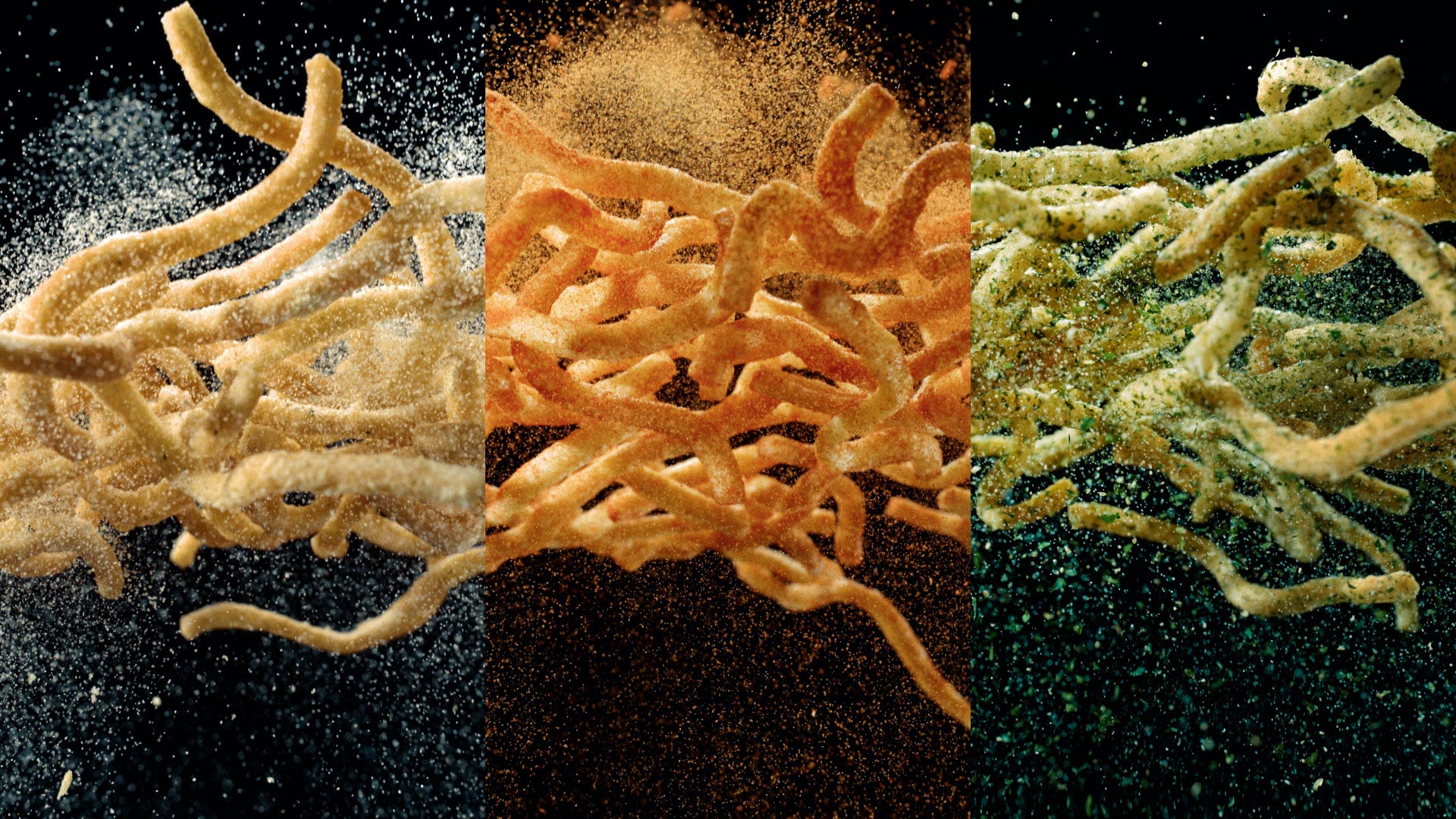 丸亀製麺のもちもちのうどんを揚げることで生まれるのは、今までにない軽快な食感。一口食べれば「サクッ!」という心地よい音が、気分まで軽やかにしてくれます。この食感の秘密は、店内で製麺するうどん一本一本に、丁寧に揚げ粉をまとわせ、うどんの小麦の風味や旨みはしっかりと閉じ込めつつ、余分な水分だけを丁寧に飛ばすこと。そのような製法できめ細やかで軽いサックサク食感を実現します。
