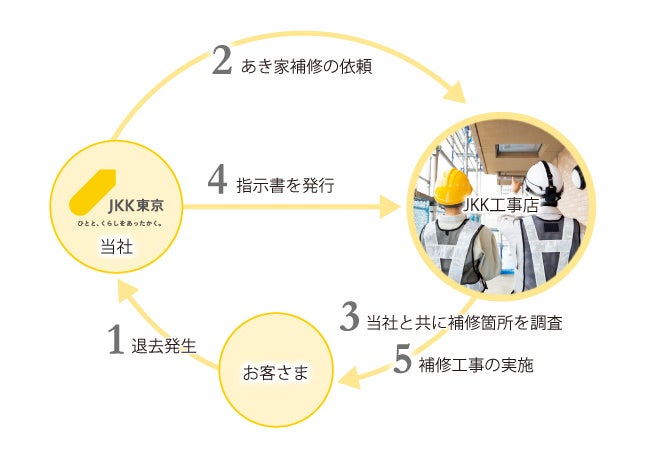 退去が発生した際、JKKからJKK工事店にあき家補修工事の依頼をします。