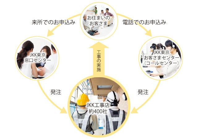 JKK工事店は、お客さまに直接連絡をとり、不具合箇所を調査し、修繕を行います。