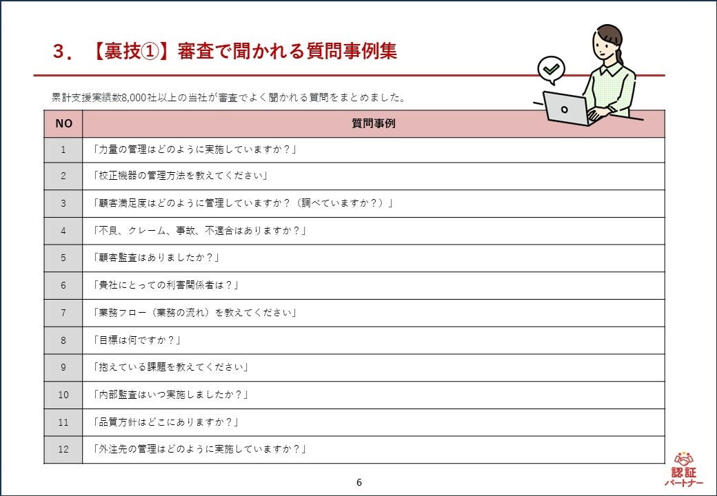 そこで、創業26年・支援実績8,000社以上の弊社が、現場で培ったノウハウを結集し、新資料『【運用に役立つ裏技掲載】ISO9001担当者が初めに読むべき資料』を作成いたしました。本資料では、審査でよく問われる質問事例集、自社のムダを見直すためのチェックリスト、ISO運用を効率化するためのヒントなど、ISO9001の新規認証・運用に役立つ実践的な内容をまとめています。「どうしても手間がかかる」「今の運用を見直したい」とお考えの方にこそ、ぜひお読みいただきたい資料です。