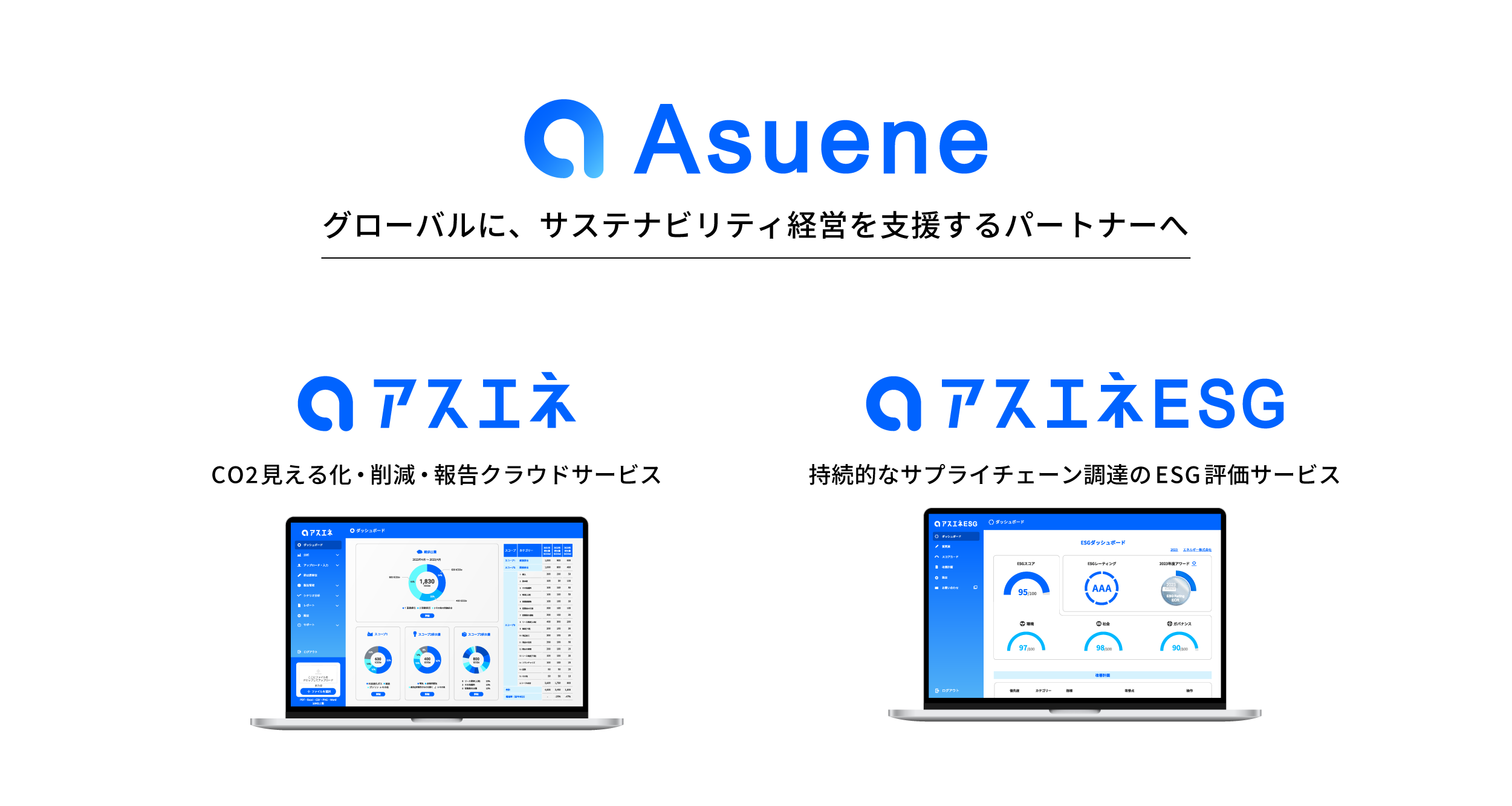 当社はこれまで、CO2見える化・削減・報告クラウドサービス「アスエネ(旧:アスゼロ)」や、ESG評価クラウドサービス「アスエネESG(旧:ESGクラウドレーティング)」をはじめとするサステナブル経営支援サービスを提供してきました。