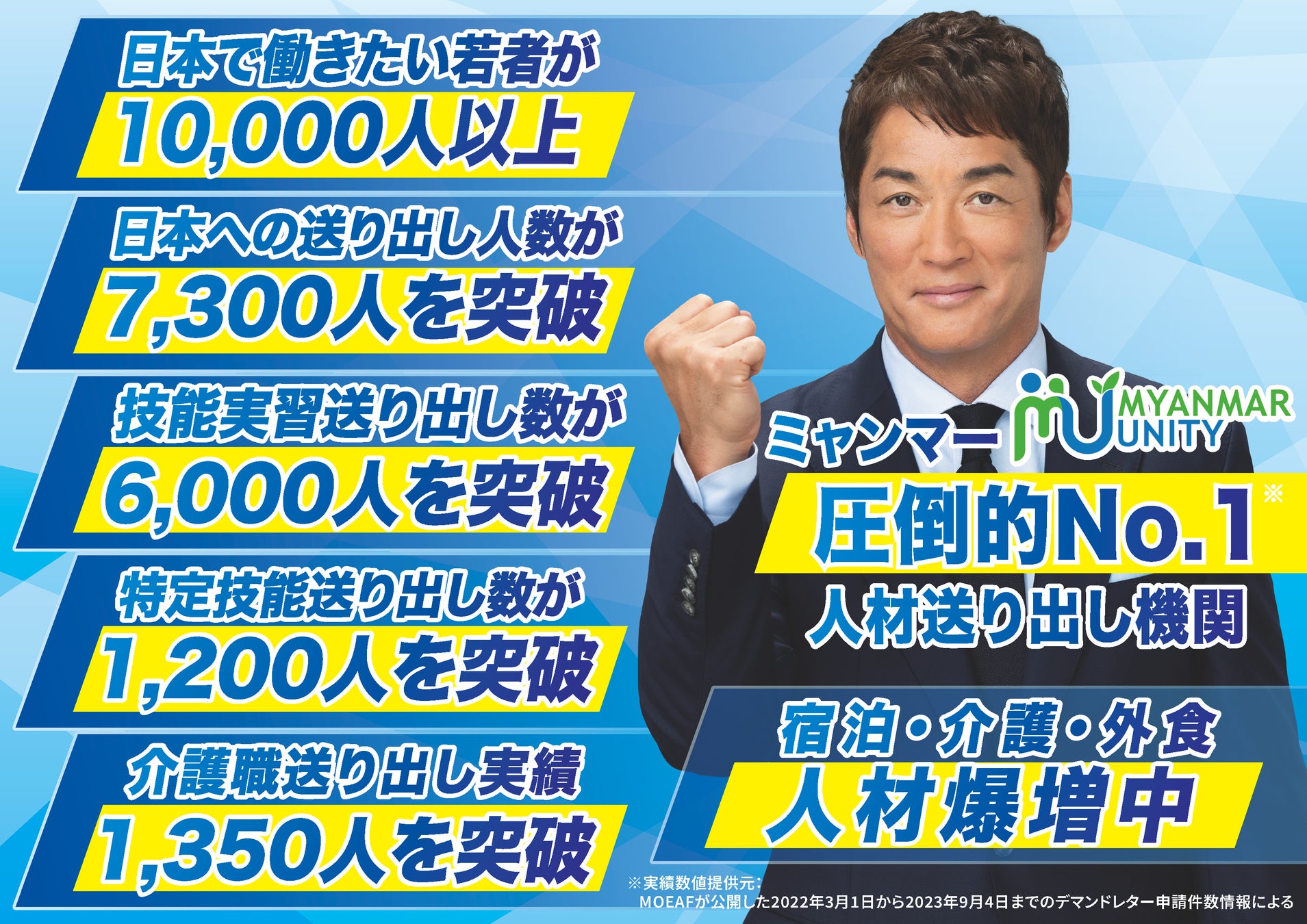 ミャンマー政府認定圧倒的No.1人材送り出し機関「ミャンマー・ユニティ」の特定技能送り出し人数が1,200人を突破。技能実習は6,000人を突破。総送り出し数は7,300人を突破。介護職送り出し数は1,350人を突破しました!