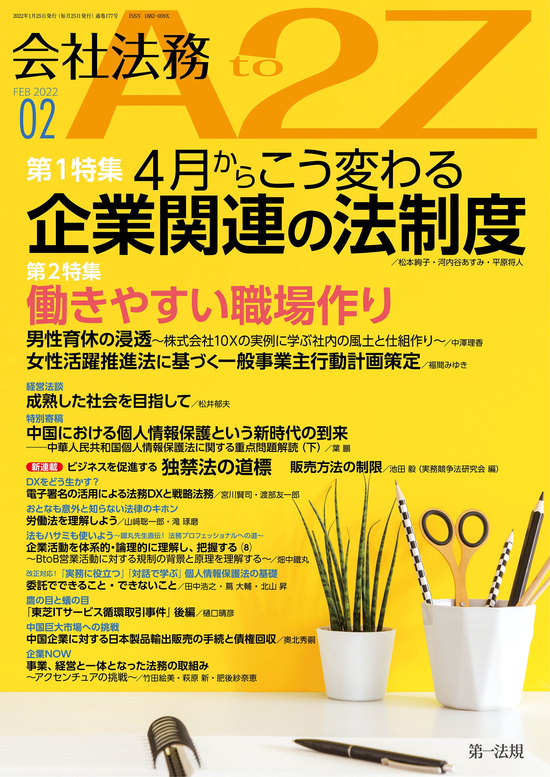 法律関連出版物、各種データベースを提供する第一法規株式会社(所在地:東京都港区、代表取締役社長:田中 英弥)は、『会社法務A2Z 2022年2月号』を2022年1月25日に発刊しました。