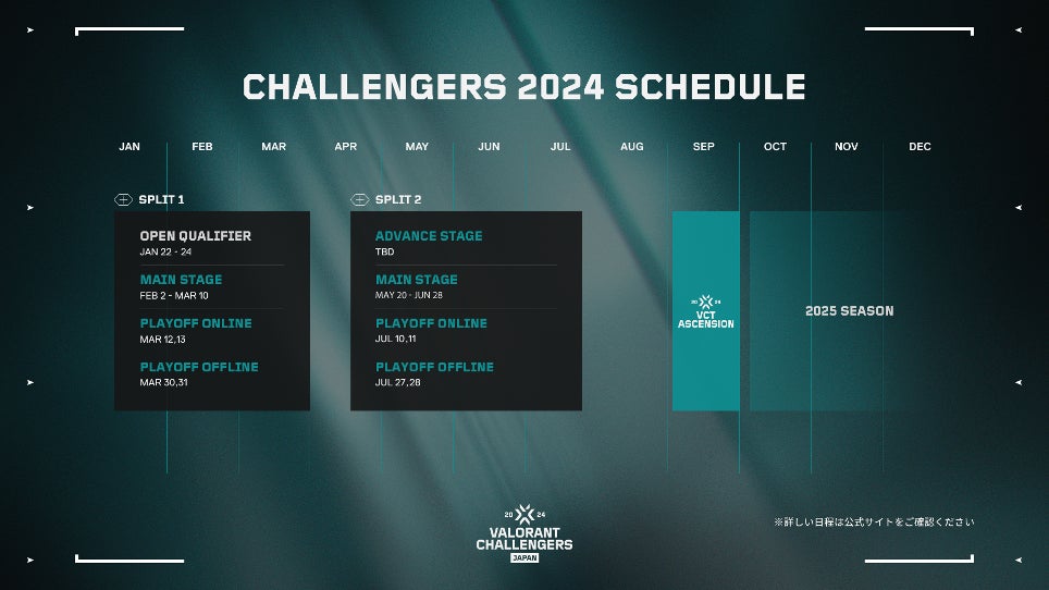 9月に2024 Ascensionが終了した後、10月にはVALORANT Challengers Japan 2025のキックオフが行われます。例年よりも開始が早まることによってスケジュールの空き期間が短くなると同時に、Ascensionの勝者にはインターナショナルリーグに向けて十分な準備期間が取れることになります。