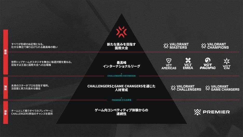ChallengersとAscensionは、VCTの最高レベルに到達しようという意志を持つプレイヤーにその機会を提供することを目的として進化を続けます。Challengersは各地域のショーケース、すなわち世界中に広がる数多くのVALORANTコミュニティーから最強のプレイヤーが羽ばたくための舞台として機能することになります。