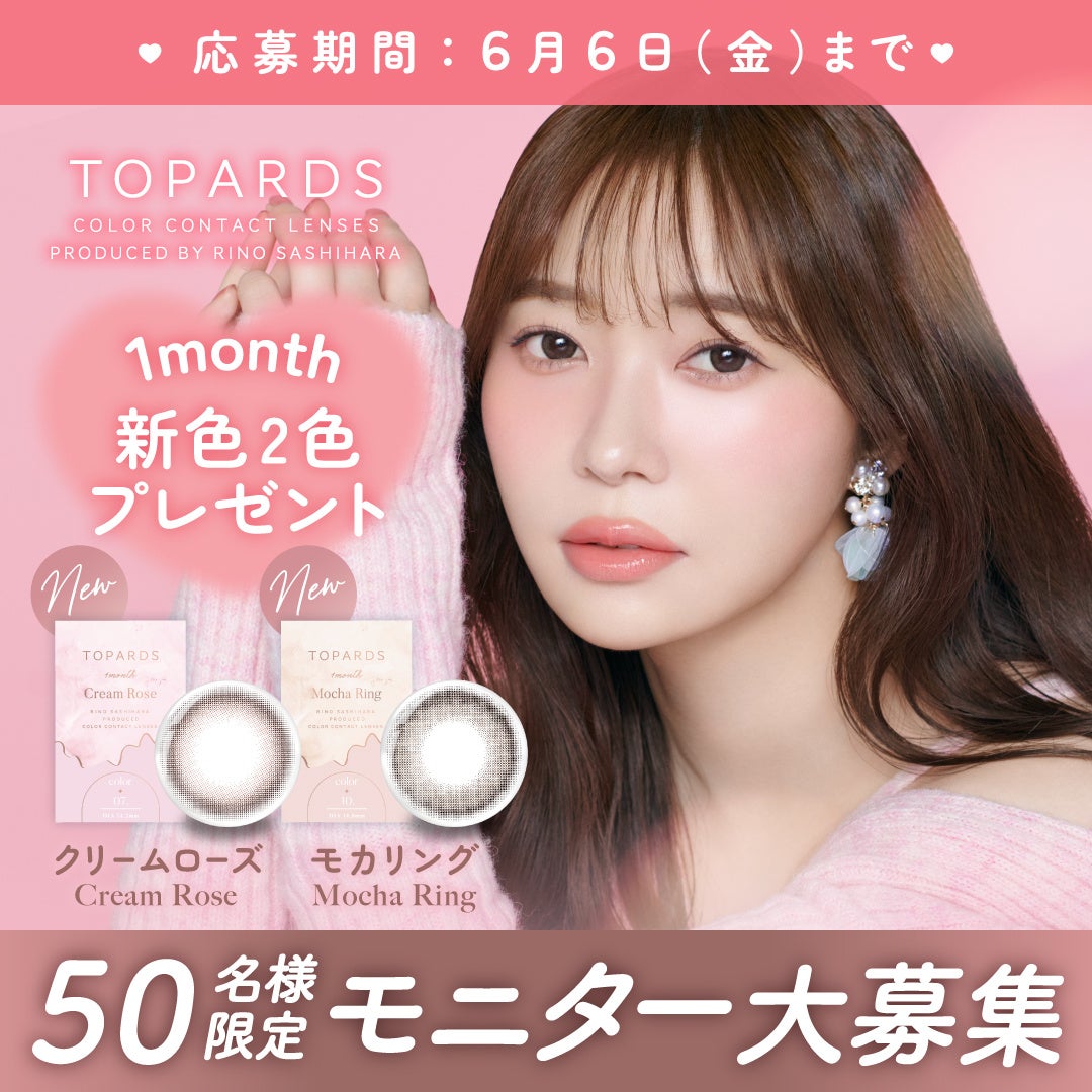 PIA株式会社(本社:東京都品川区 代表取締役:見原 博道)はカラコン支持率No.1(※)指原莉乃さんプロデュースのカラーコンタクトレンズブランド『TOPARDS 1MONTH(トパーズ ワンマンス)』より、「Cream Rose(クリームローズ)」「Mocha Ring(モカリング)」の新色2色を2025年5月30日(金)よりQoo10、その他一部WEB店舗にて先行発売いたします。