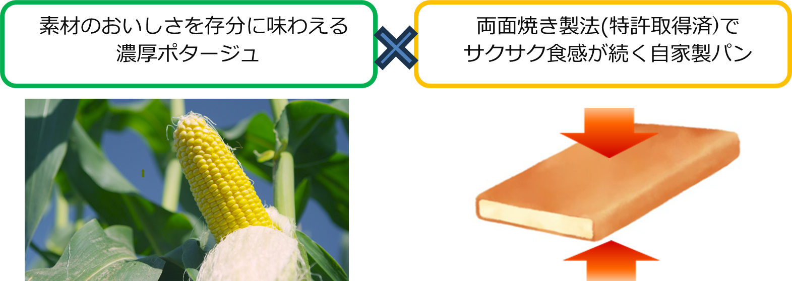 (2)特 長:「クノール®」で培ったレシピ設計技術、当社独自素材を活用した素材のおいしさが溶け込んだ濃厚なポタージュの味わいと、焼きたてのようなサクサク食感のパンの味わいが最後の一口まで感じられる、気持ちもお腹も満たすことのできるパン入りスープです。