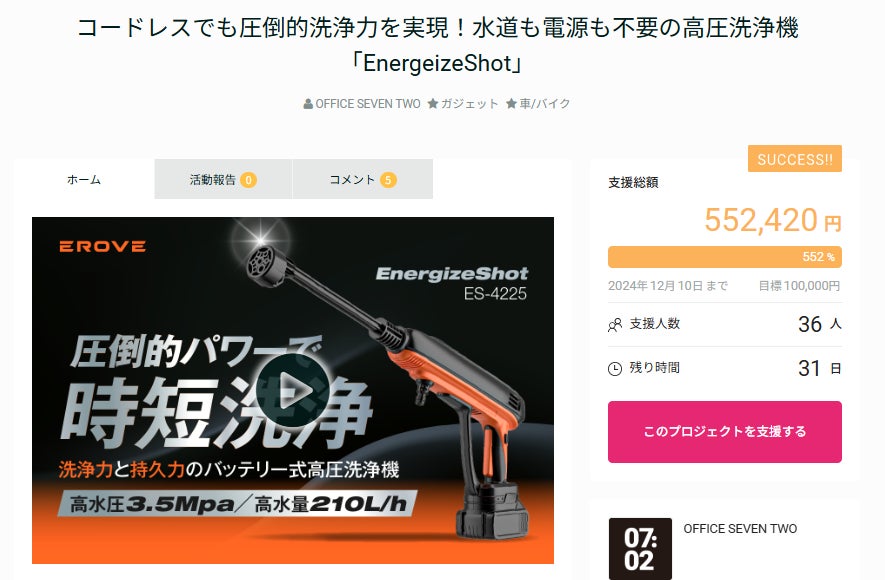 コードレスでも圧倒的洗浄力を実現!水道も電源も不要の高圧洗浄機「EnergeizeShot」が多くの支援を受けています