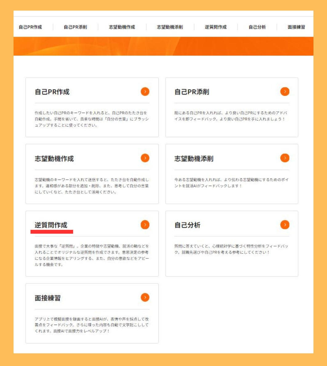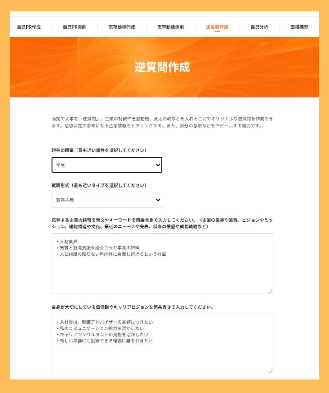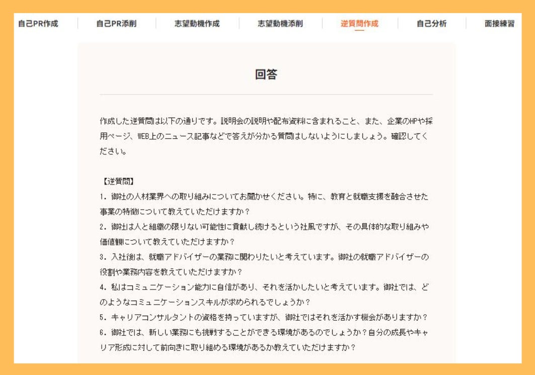 作成された逆質問のたたき台をベースに、利用者ご自身で改めて企業にアピールしたいポイント・聞きたいことを精査し、より質の高い逆質問内容を完成させます。