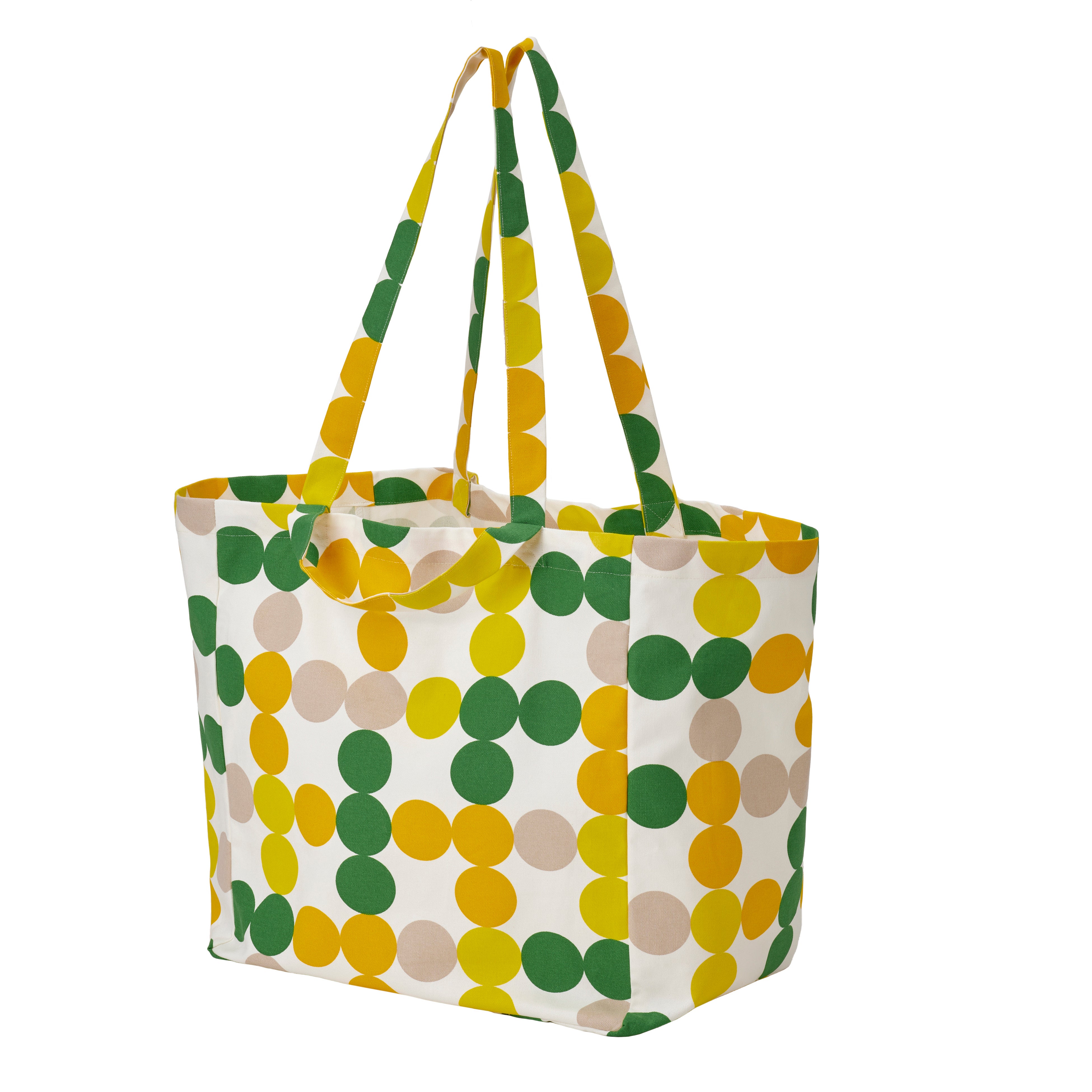 持ち手、内ポケット、カラフルな水玉模様が付いた大容量の布製バッグ。内ポケットはファスナー付きで、小物の収納に便利です。通気性と放湿性のある生地なので、普段の買い物はもちろん、スポーツバッグやビーチバッグとしても使えます。