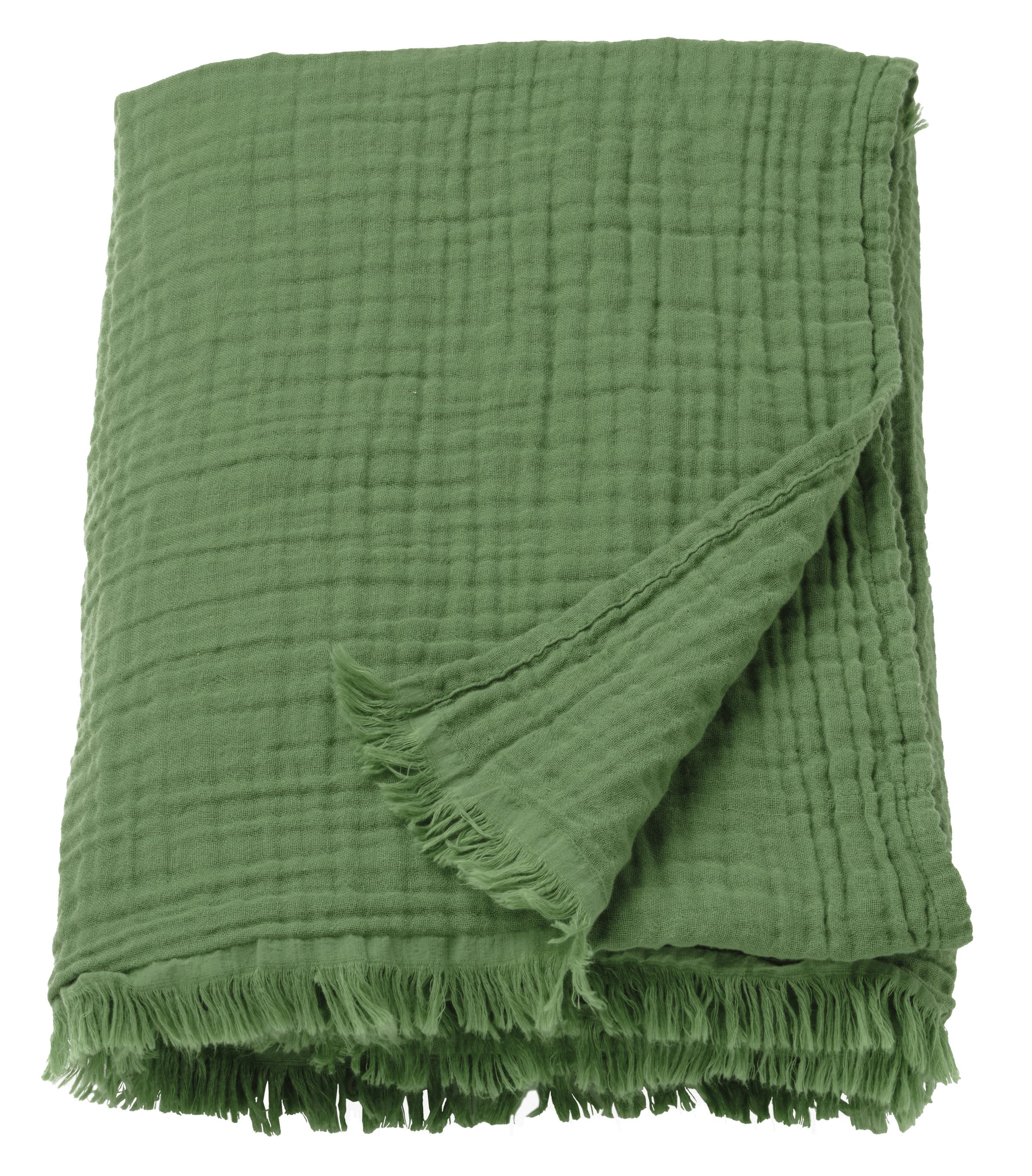 このとても柔らかなグリーンのひざ掛けをソファの上に掛けたり、肩に巻いたりすれば、一瞬でリラックスした雰囲気に。多層のコットンモスリンがつくり出すシワのある風合いは、切りっぱなしのフリンジとよく調和しています。二重織りなので、柔らかく通気性に優れています。柔らかな肌ざわりのひざ掛け。洗濯機で洗えます。