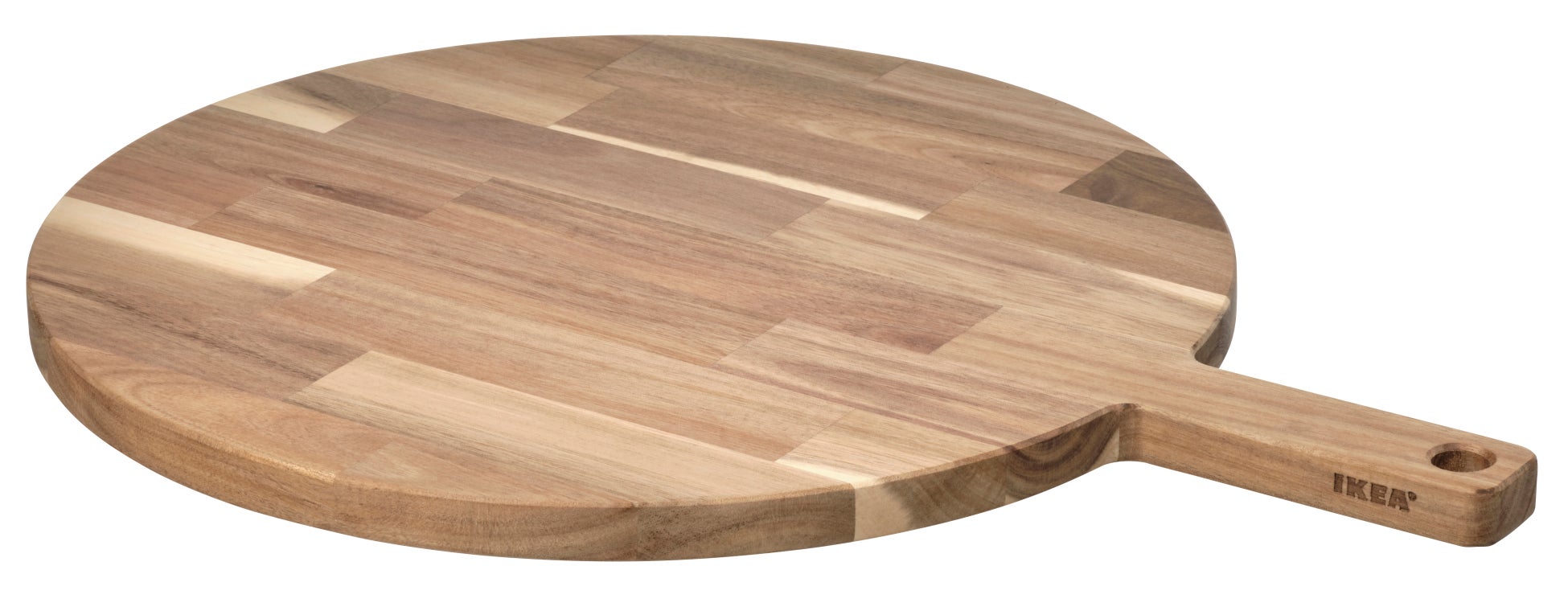 この丈夫なアカシア材製の円形のまな板は、キッチンで食材を刻んだり切ったりするのはもちろんのこと、テーブルの上に置いてもおしゃれで、パンやハム、チーズなどを盛り付けるのにぴったり。持ち手に穴が開いているので、つるして収納できます。