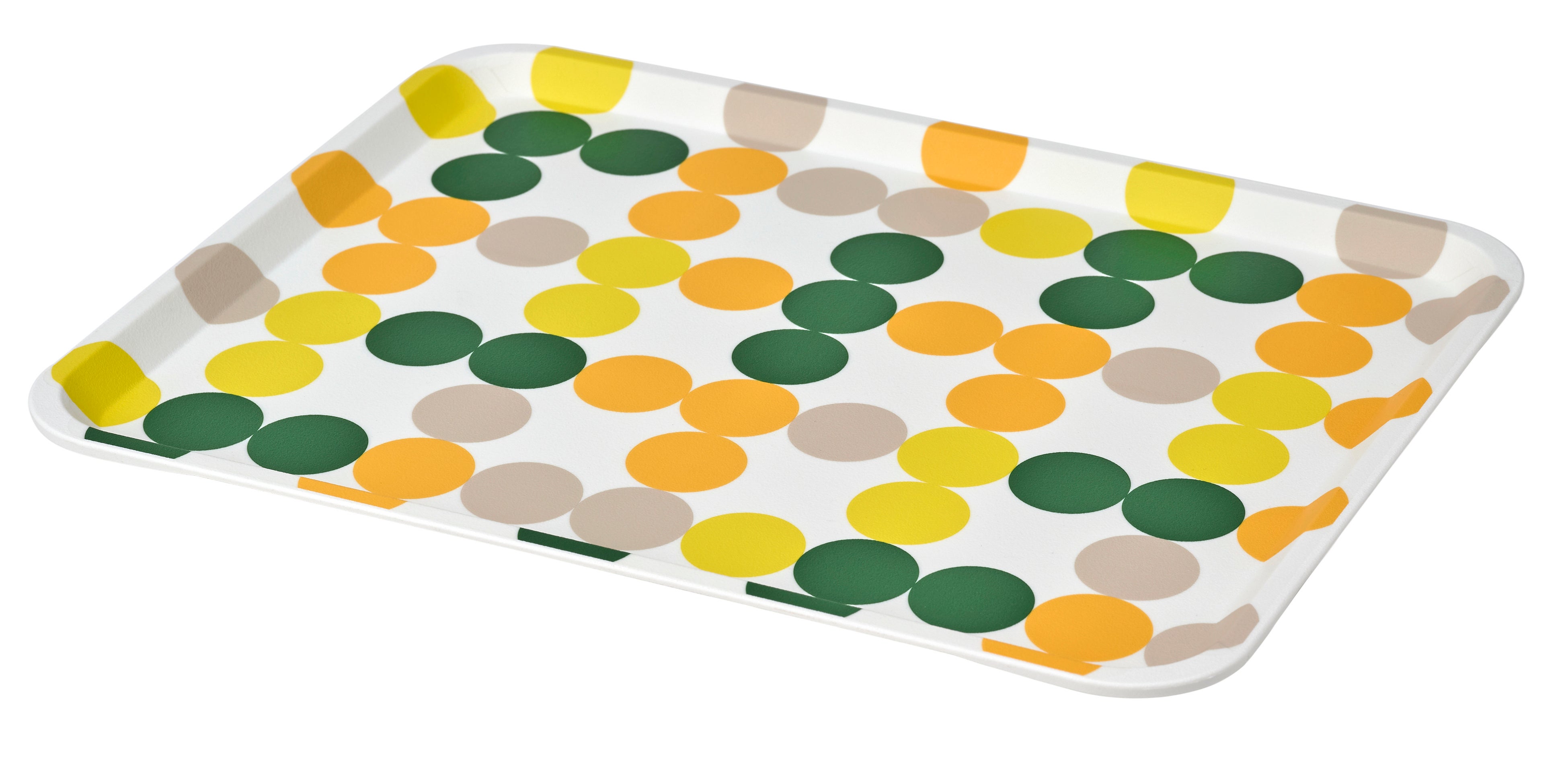 カラフルな水玉模様が付いたこのトレイは、縁が上に曲がっているので、持ち運ぶときに、のせたものが滑り落ちにくくなっています。朝食用のトレイや、テレビを見ながらのティータイム用のトレイとして、屋内だけでなくバルコニーや庭で楽しみたいときに最適です。