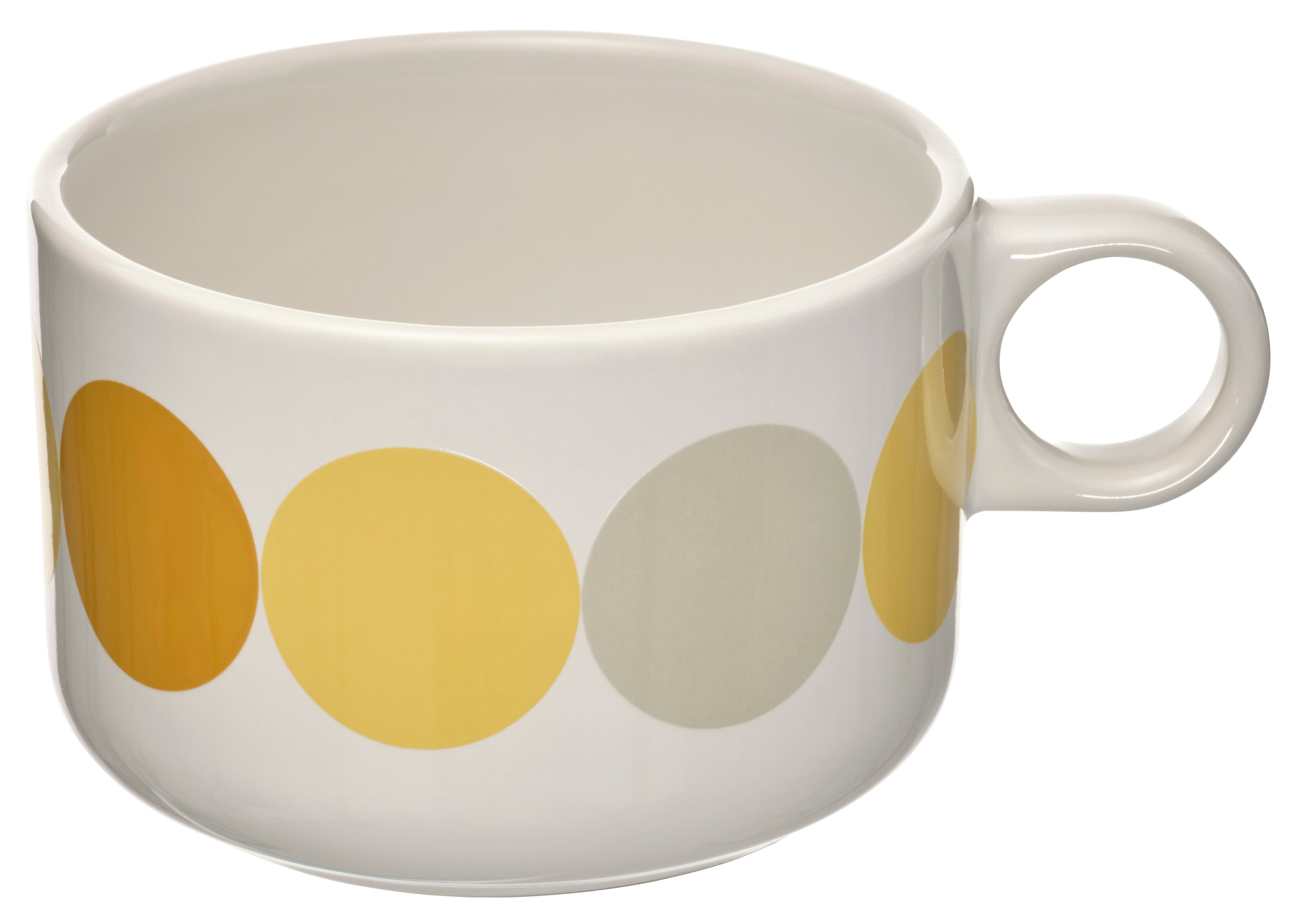 カラフルな模様とレトロな形が特徴のホワイトのマグ。水玉模様がホワイトのマグをカラフルに彩ります。太陽が降り注ぐバルコニーで楽しむコーヒータイムにも、あたたかい夏の夜に庭でくつろぐティータイムにも最適です。耐久性の高いせっ器製です。