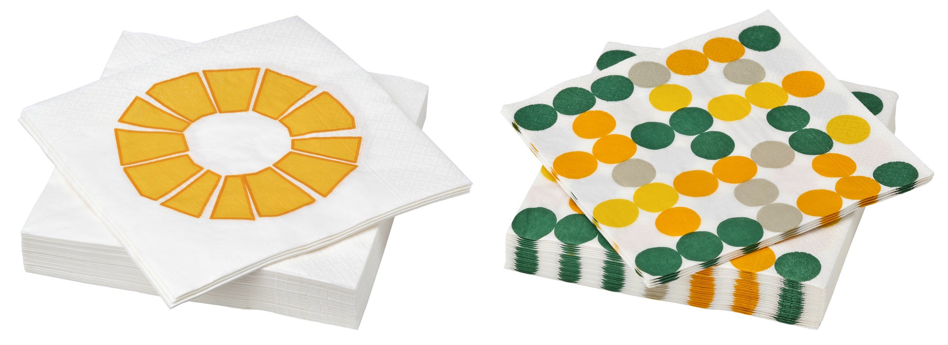 夏らしいテーブルを演出できる紙ナプキン。クッションカバーとおそろいのパイナップルの模様と、太陽と草の色をインスピレーションにした遊び心のある水玉模様の2パターン用意しました。朝食やコーヒーブレイク、パーティーを活気ある雰囲気にします。模様入りのナプキンをプラスするだけで、テーブルコーディネートをおしゃれに演出できます。