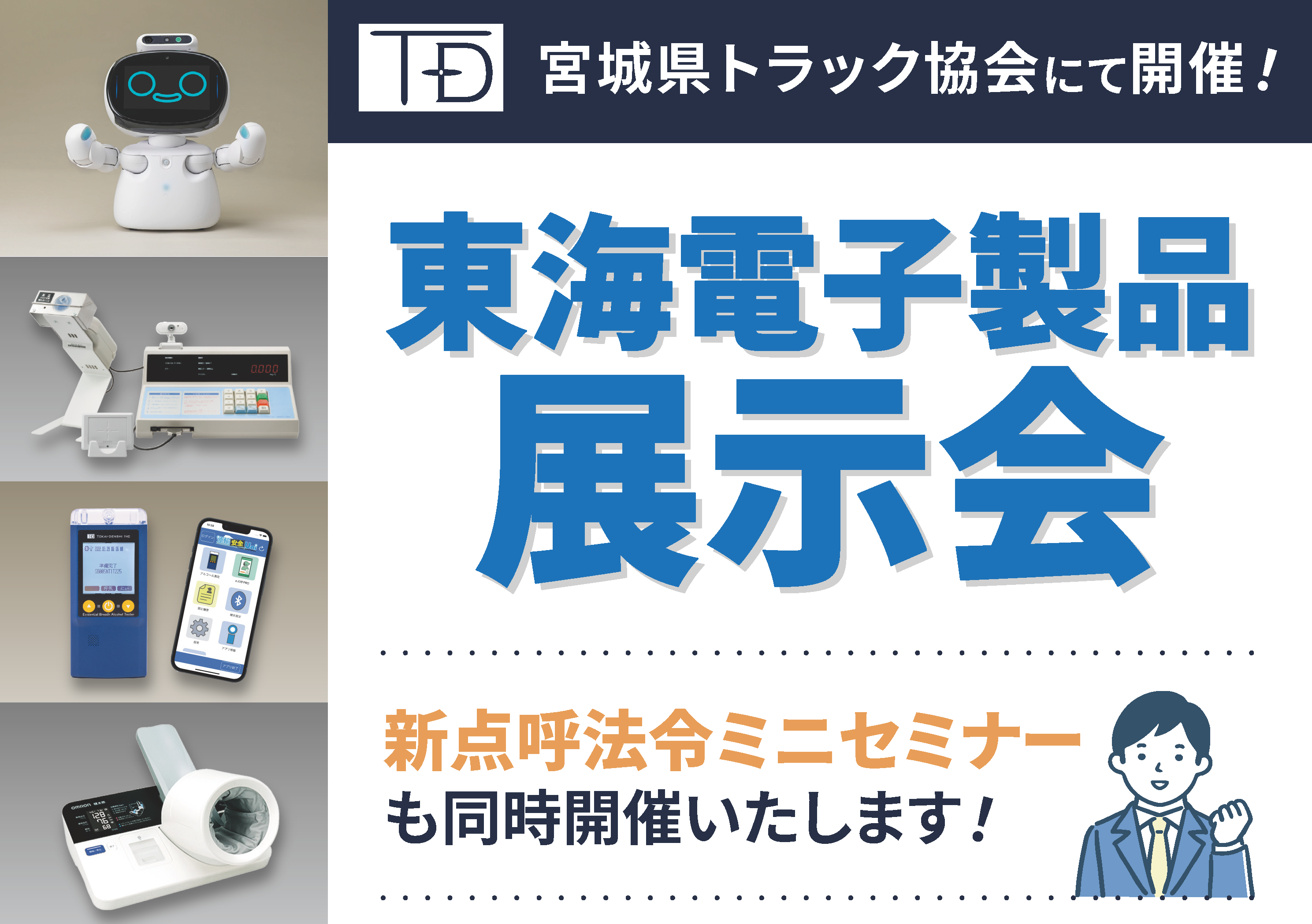 アルコール検知システム、 IT点呼システム、 運行管理システムを開発・販売する東海電子株式会社(本社:静岡県富士市 代表取締役 杉本 哲也)は、 8月23日(金)に宮城県トラック協会にて、アルコール検知器、遠隔点呼対応システム、血圧計・体温計連動システムなどの製品を一堂に集めた展示会を無料開催いたします。また、改正後の点呼告示についてご説明する「新点呼法令セミナー」も同時開催いたします。事前予約は不要です。お気軽にお立ち寄りください。