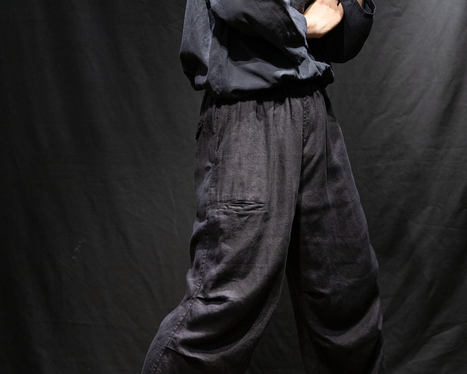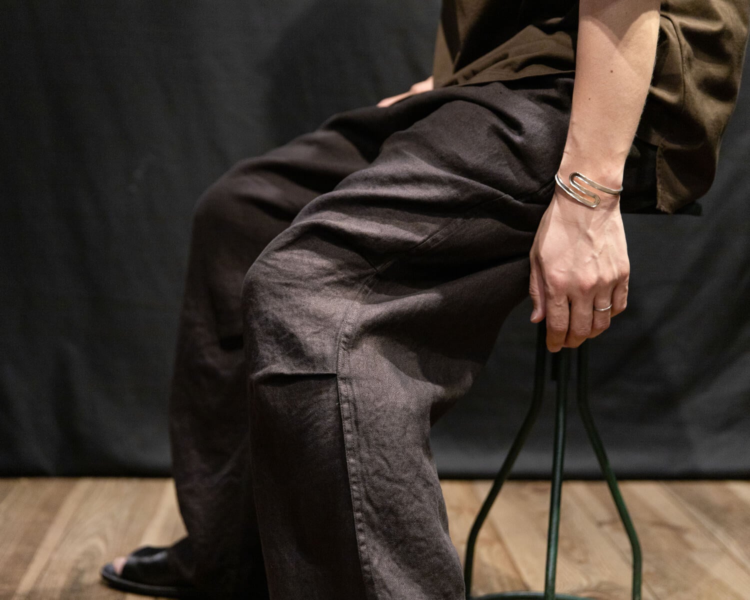 4年目となるリネンアムンゼン、今季は2型。1型は2021年に初代としてデビューしたミリタリーパンツを復刻。もう1型は、内向きに大きく摘まんだテーパードイージートラウザーズ。