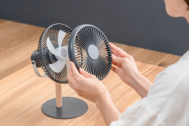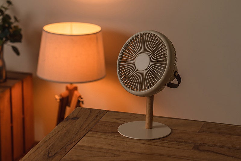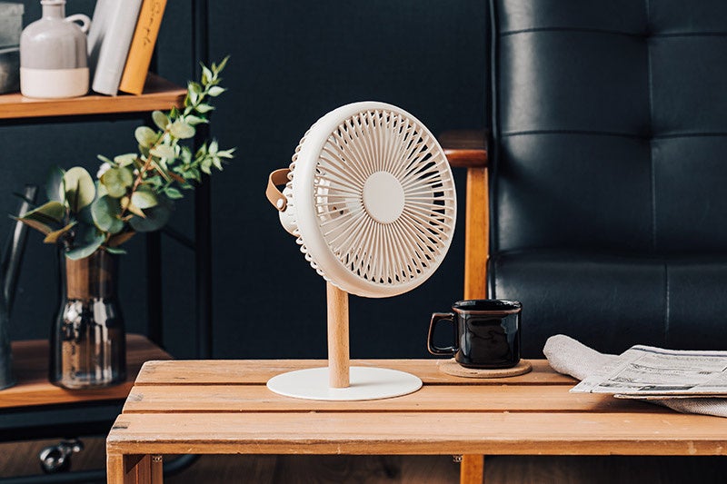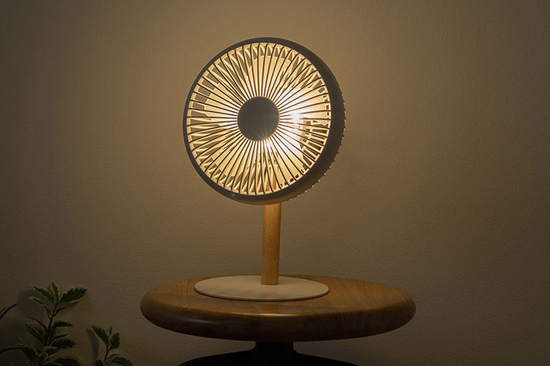 リアルウッドとレザー調ベルトがおしゃれ!2024年夏の新作「ミニリビングファン LEDライト付」が新発売。【ライフオンプロダクツ】
