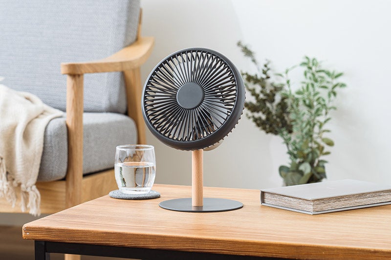 リアルウッドやレザー調ベルトをアクセントに用いた、デザイン性の高いリビングファン。コードレス設計で使い勝手の良さも◎。